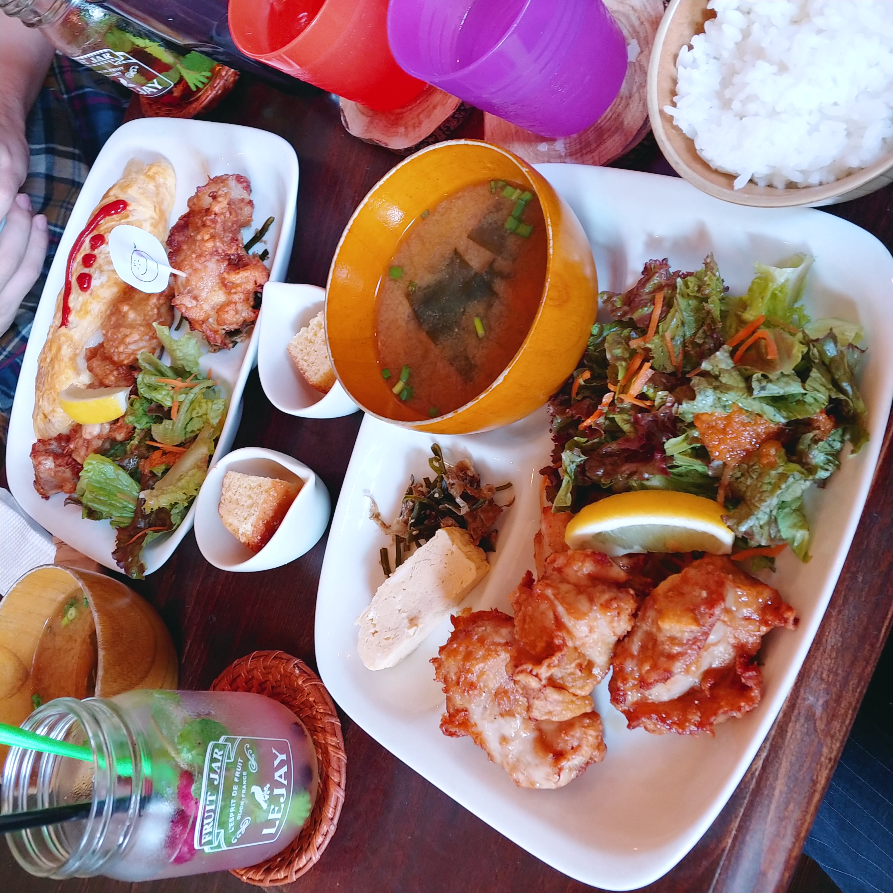 저는 가라아게를 쌀가루로 튀겼다길래 가라아게 정식을 시켰고 친구는 오므라이스 정식을 시켜서 가라아게를 추가했어요. 점심 세트라 그런지 다 그런진 모르겠지만 한 입 디저트도 공짜로 주시더라구요.