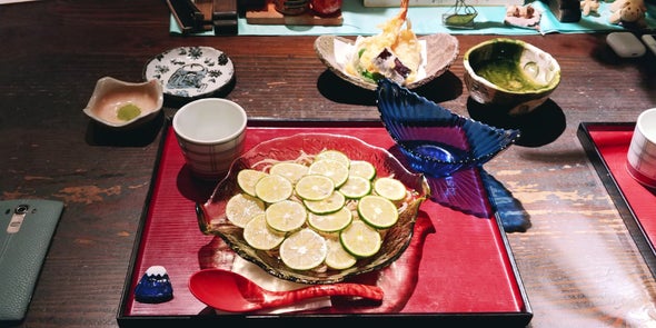 왼쪽에 있는 건 장국이 특별한거고 오른쪽은 スダチ(스다치)라고 귤의 일종인데 그걸 잔뜩 올려서 아주 산뜻하게 먹는 소바에요.
