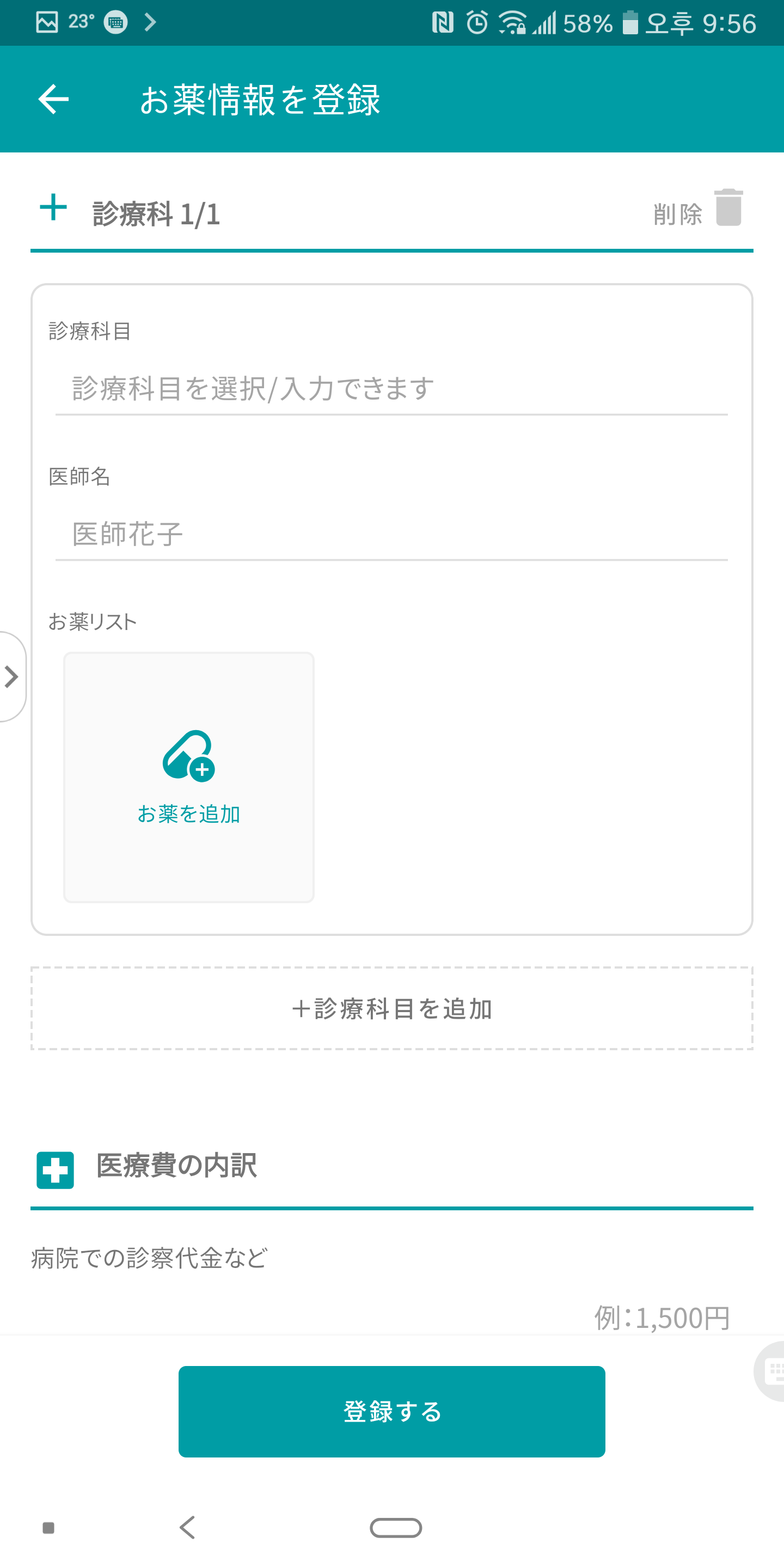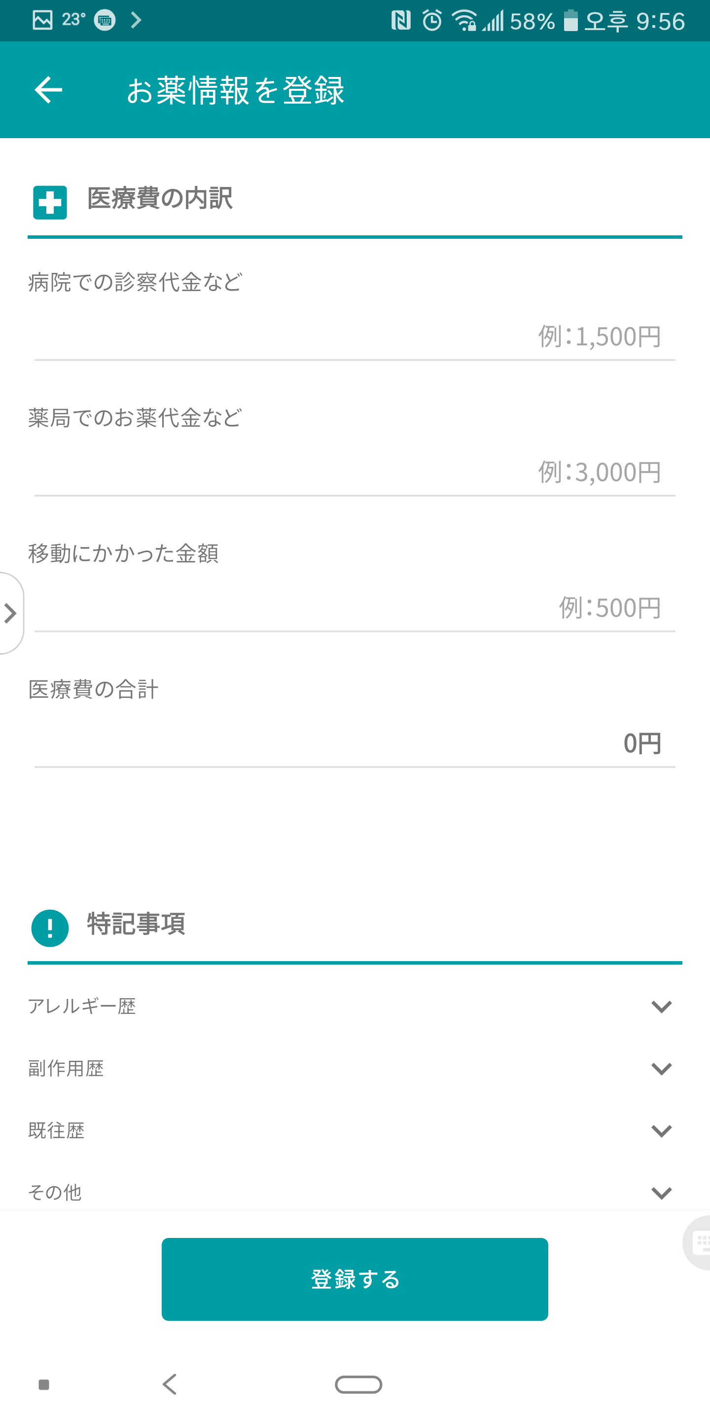 약 정보를 적는 화면에서 돌아와 스크롤을 아래로 내리면 의료비 내역(医療費内訳: 이료-히우치와케)를 적는 곳이 있는데 진료비(病院での診療代金など), 약값(薬局でのお薬代金など), 병원까지 가는데 들은 교통비(移動にかかった金額)을 적으면 이 병원은 비싸구나 저렴하구나를 알 수 있어요.