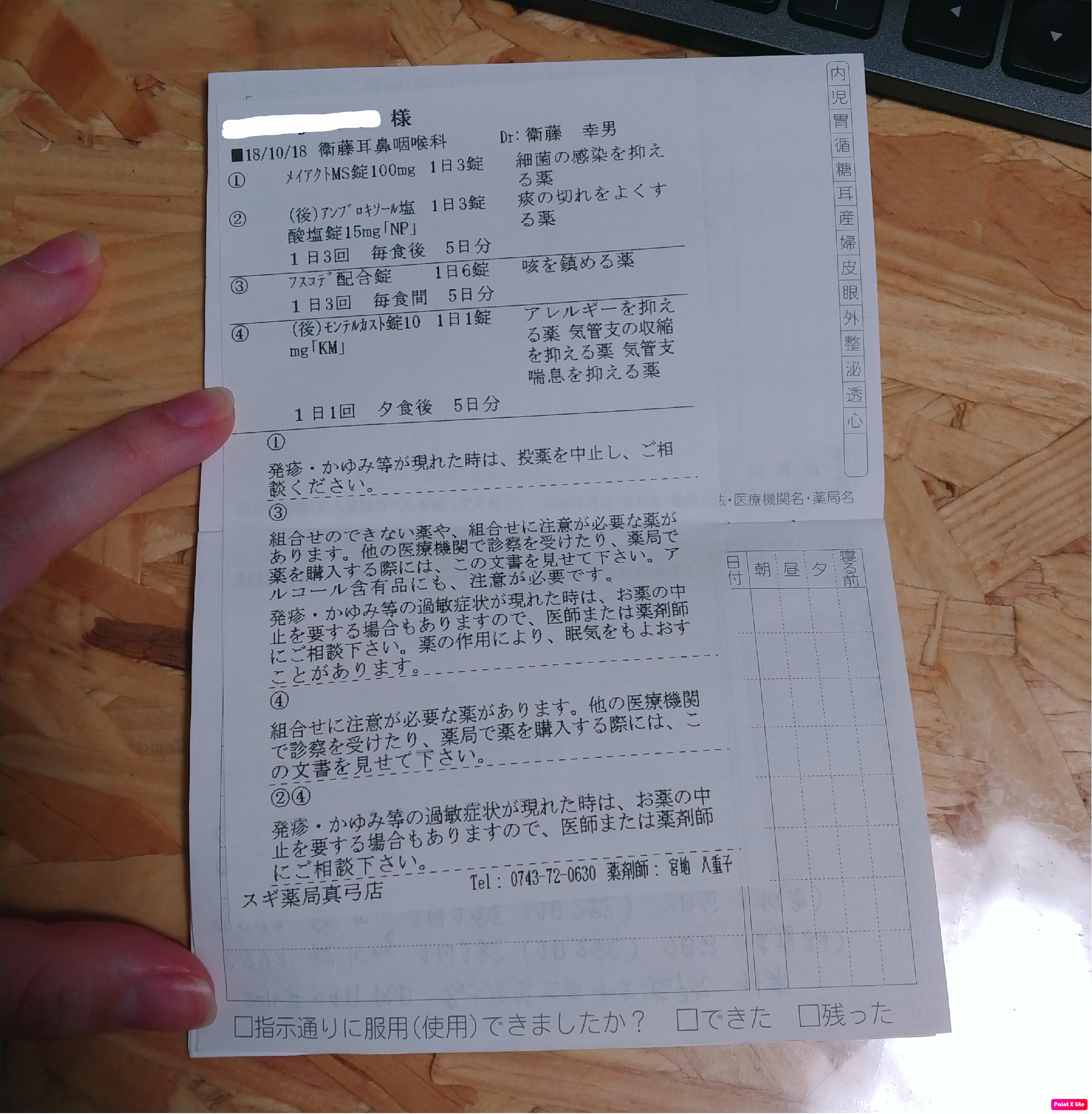 처음 가는 약국에 가서 처방전을 내밀면 설문조사지 (ジェネリック; 제네릭 의약품을 사용해도 되는지 어떤 성분을 사용하면 안되는지 등에 대한 질문) 를 주면서 오쿠스리테쵸-는 가지고 오셨냐 물어봅니다.