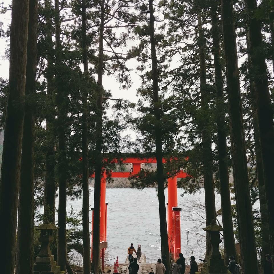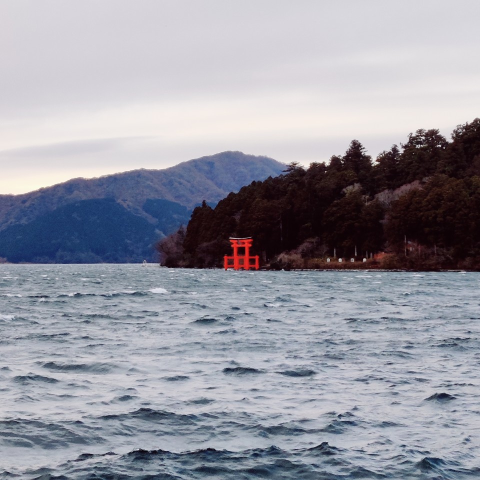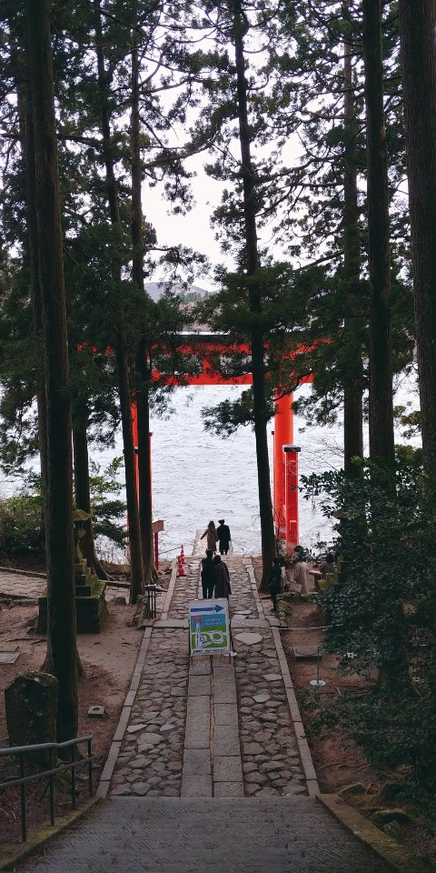 료칸에 올 때와 같은 방향인 箱根町港행 버스를 20분 정도 타고 가면 호수가 나오는데 그 옆에 신사가 있습니다.