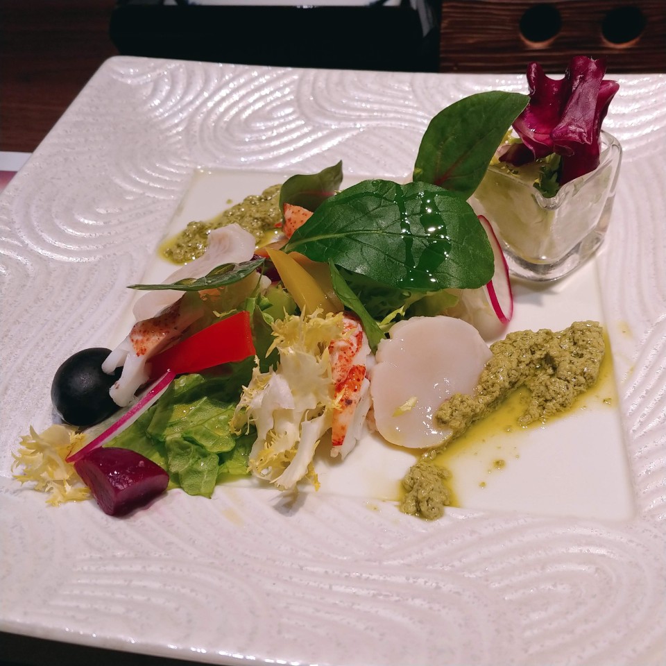 이 에피타이저가 진짜 맛있었어요!! 바질페스트와 관자 회, 게살을 같이 먹는 거였는데 와.. 부드럽고 고소하고.