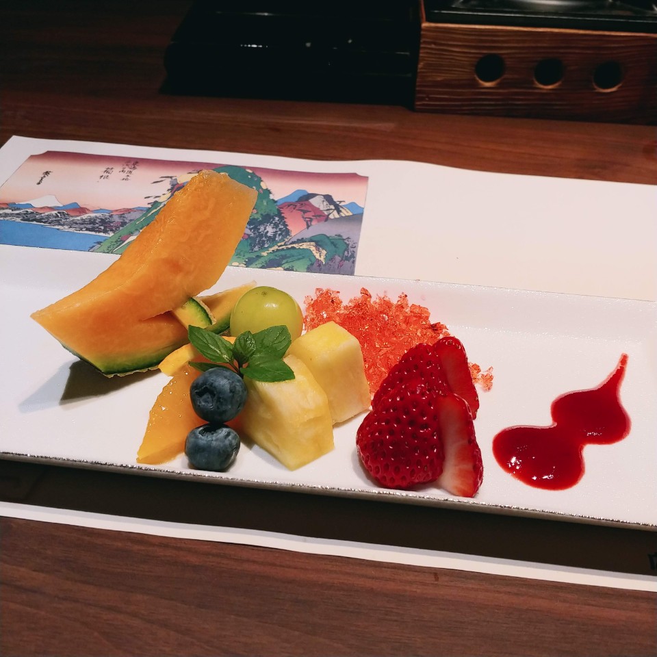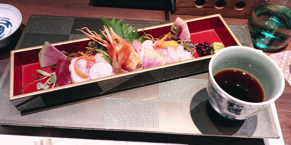 접시에 있는 것들의 정체는 다랑어(鮪: 마구로), 방어(寒鰤: 칸부리), 아마도 숭어(鱒: 마스)고 가장 뒤에 들어있는 흰색은 뭔가 두부 말린 것 처럼 생겼는데 메뉴에 적힌 한자를 보면 그렇지 않은데 붓글씨라 읽히지가 않아서 뭔진 모르겠네요.