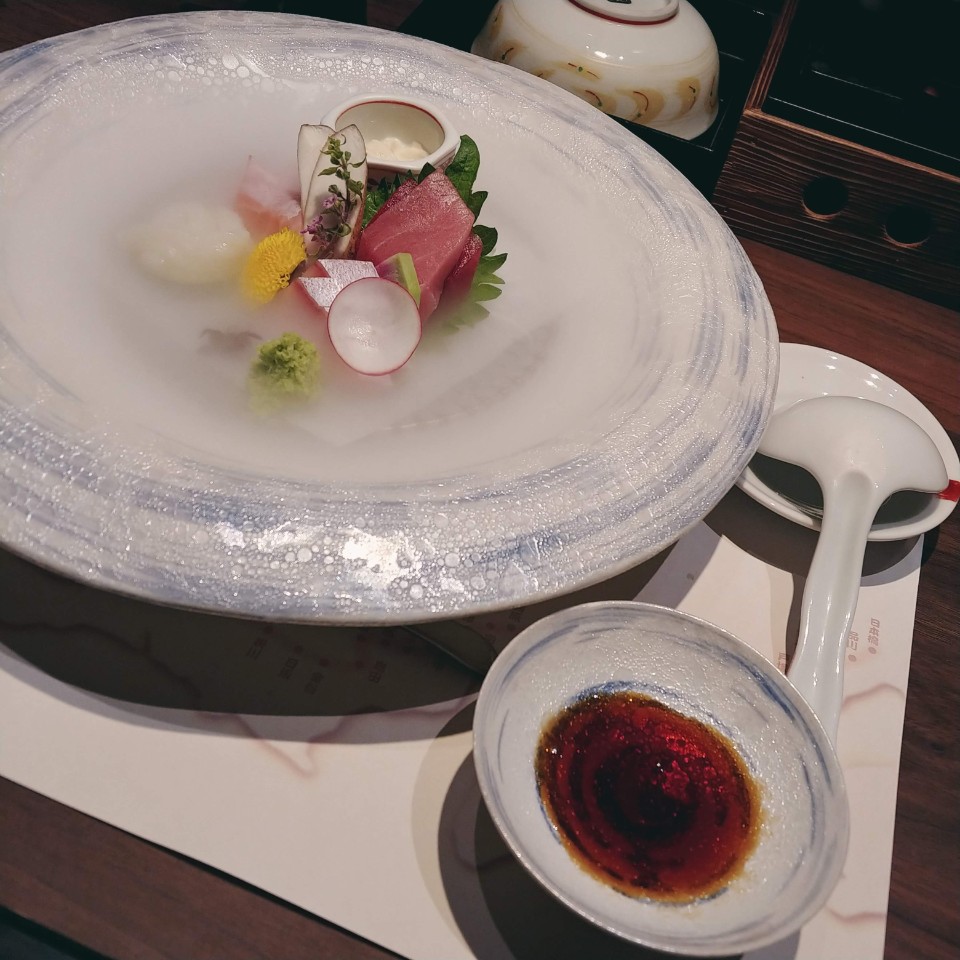 다음으로 나온 것은 御造り(오츠쿠리)라 해서 회 모듬인데 드라이아이스로 뭔가를 표현했다고 했어요. 알아듣지 못했지만.