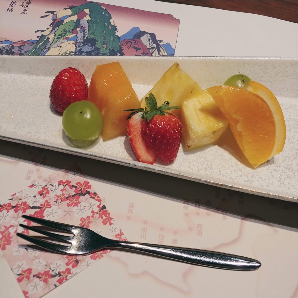 과일 있는 자리에는 원래 푸딩이 있었어야 했는데.. 우유가 들어갔단 이유로 빠졌습니다. 그러면서 녹차를 주더라고요?? 카페인 안된다 했는데? 차랑 커피랑 다 안된다고 했는데? 귀찮아서 따지진 않고 그냥 안 마셨습니다.