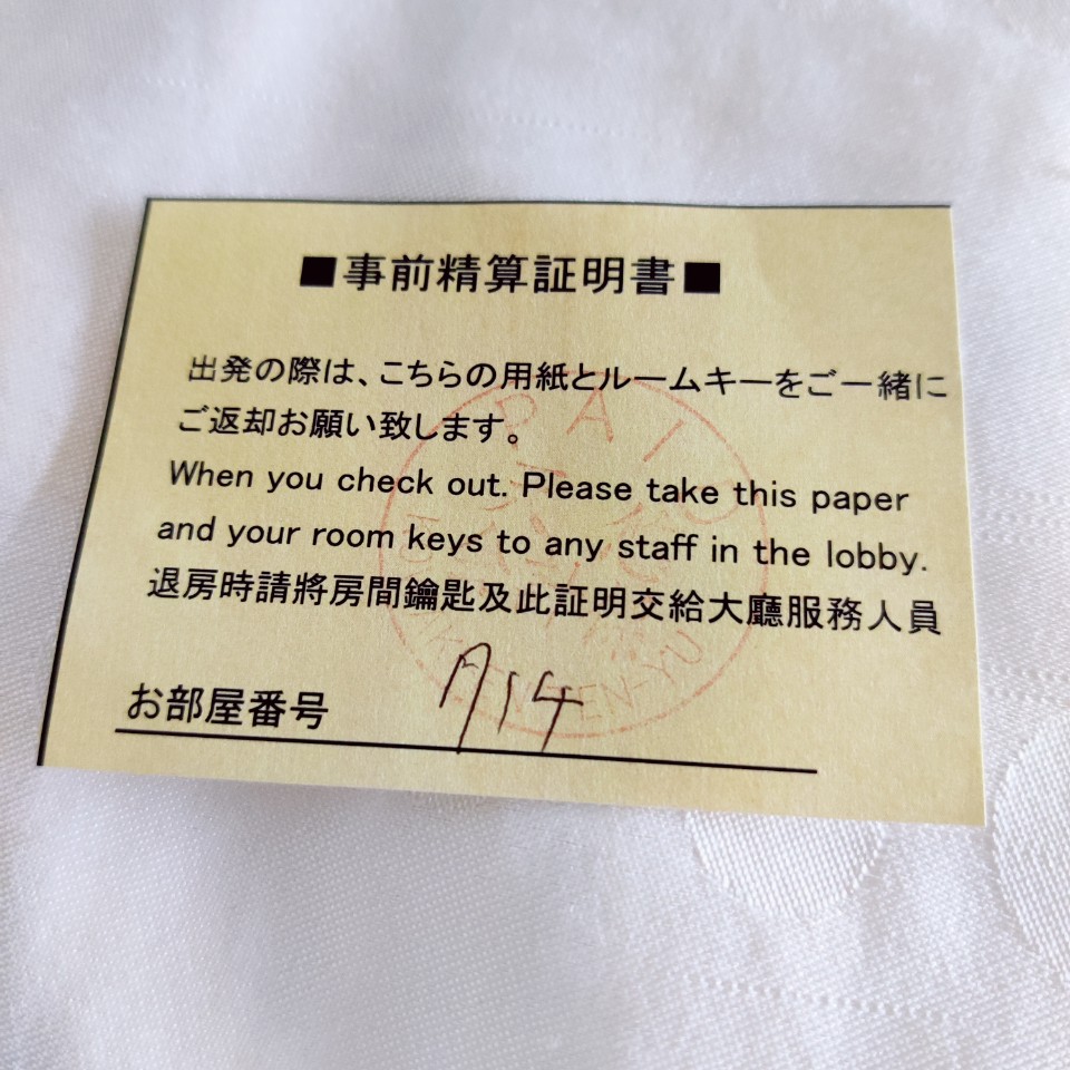 일찍 정산하면 이런 노란 표를 줍니다. 정산하고 나중에 체크아웃 할 사람들은 얘랑 같이 열쇠를 반납하면 줄 서지 않아도 된다는 표에요.