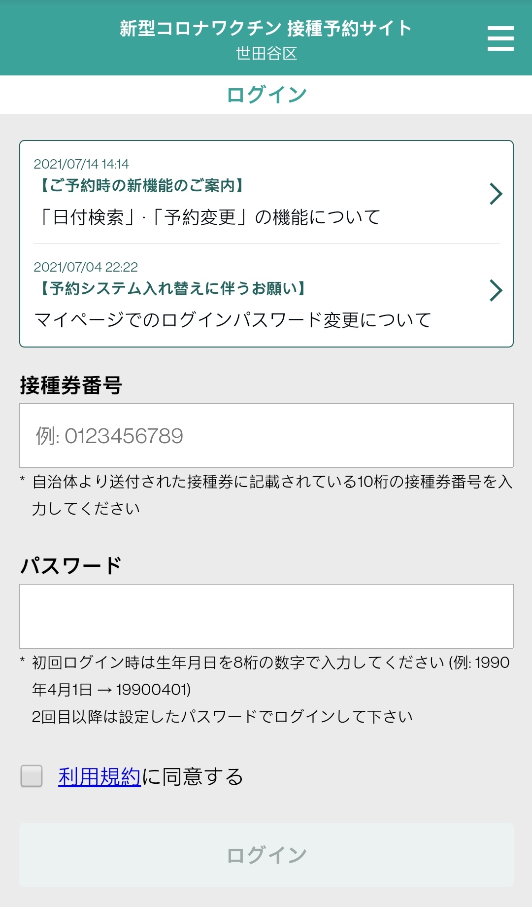 세타가야구 백신 접종 예약용 특설 사이트 로그인 화면 → https://vaccines.sciseed.jp/setagaya-vaccine/login