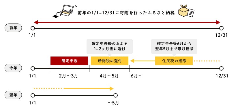 ふるさと納税는 특정 지역('응원하고 싶은 지역')에 기부금이라는 명목으로 돈을 내고 특산품을 구입하면(当해) 다음 해 확정신고기간 끝나고 전년도(当해)에 납부한 소득세 혹은 주민세를 돌려받는 제도에요.