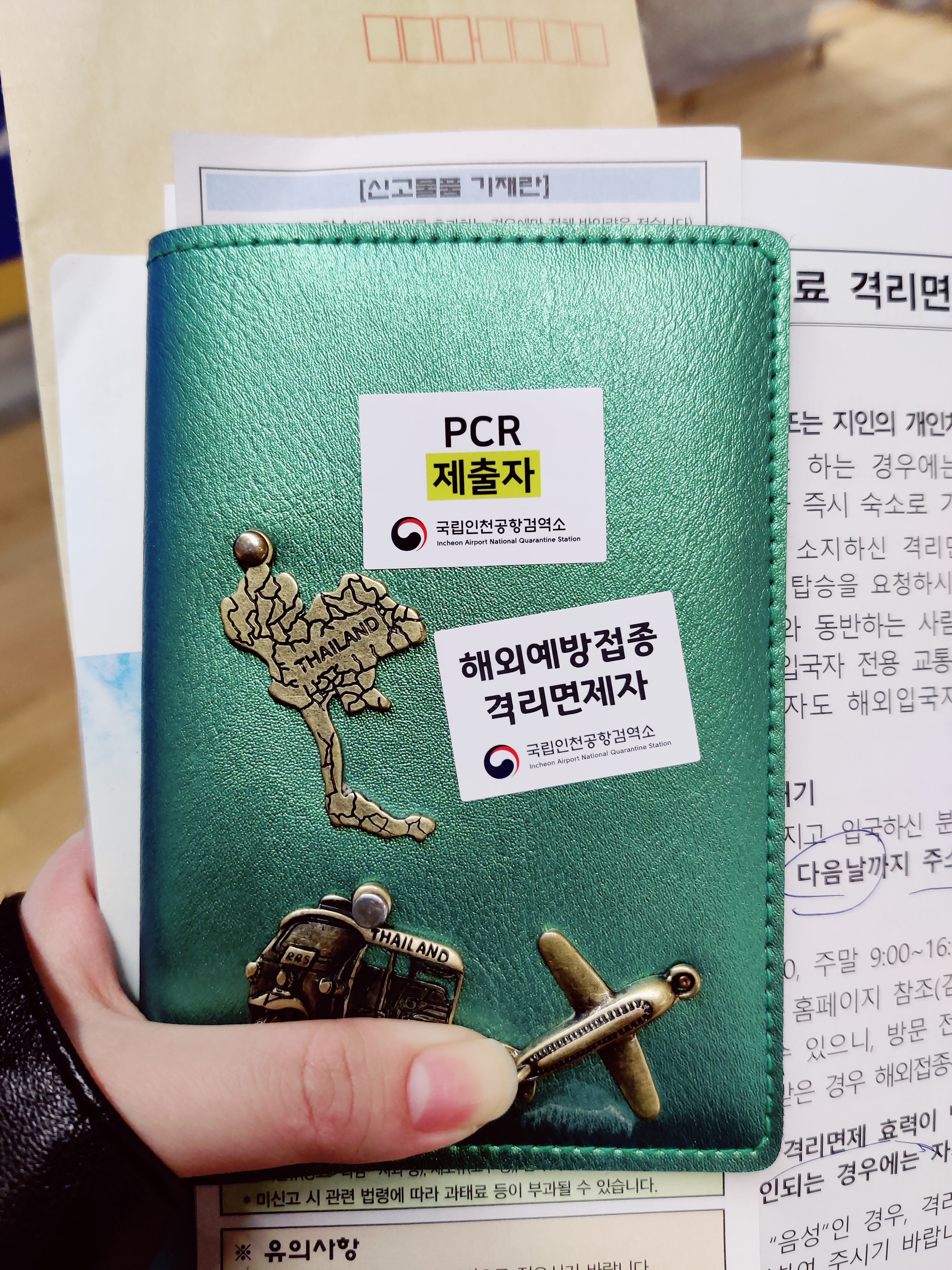 이미그레이션에서 격리면제승인자, PCR음성확인자 스티커를 여권에 붙여주는데 이거 없으면 공항에서 무사히 나가지 못하니 주의하세요.