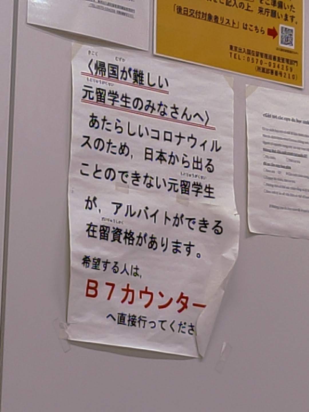 가만히 앉아서 보다보니 이런 것이 붙어있더라고요. 귀국이 어려운 유학생 비자를 가지고 있던 외국인들에게 아르바이트가 가능한 재류자격을 주겠다는 거였어요. 혹시 필요하시면 참고하세요.