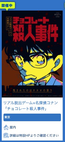 저는 제일 아랫줄에 있는 명탐정 코난과 콜라보한 <초콜릿 살인사건>에 참가하고 싶었는데 이게 사정청취편 / 현장검증편 / 탈출편 3개로 나뉘어지거든요? 현장검증편이 모르는 사람들이랑 또 어디 가서 같이 해야한다고 해서 그냥 넘겼습니다ㅠ