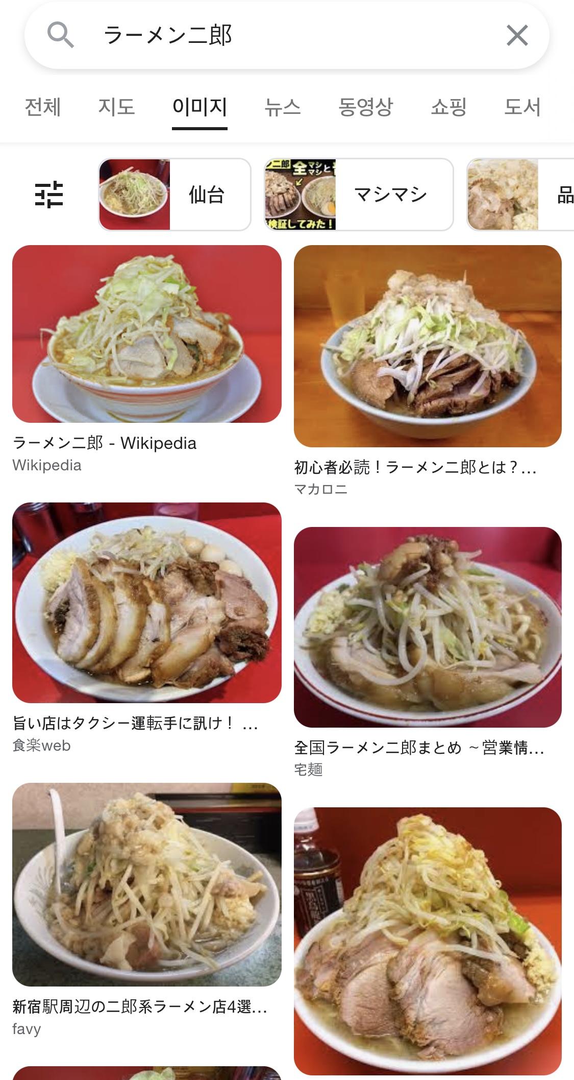 근데 어떤 느낌인지는 알았어도 도대체 '지로'의 정체를 저 혼자 알아차릴 수는 없어서 어리둥절한 표정으로 혼자만 못 웃고있다가 あのージロウってなんですか?(저기.. '지로'가 뭐에요?)라고 물어봤어요. 그랬더니 다들 빵 터져서는 ラーメン二郎를 구글링해보라고 하더군요. 사진 검색결과를 보라고. 구글에 검색해보니 아래와 같이 라멘 위에 숙주와 고기를 산더미같이 올린 것들이 나왔어요.