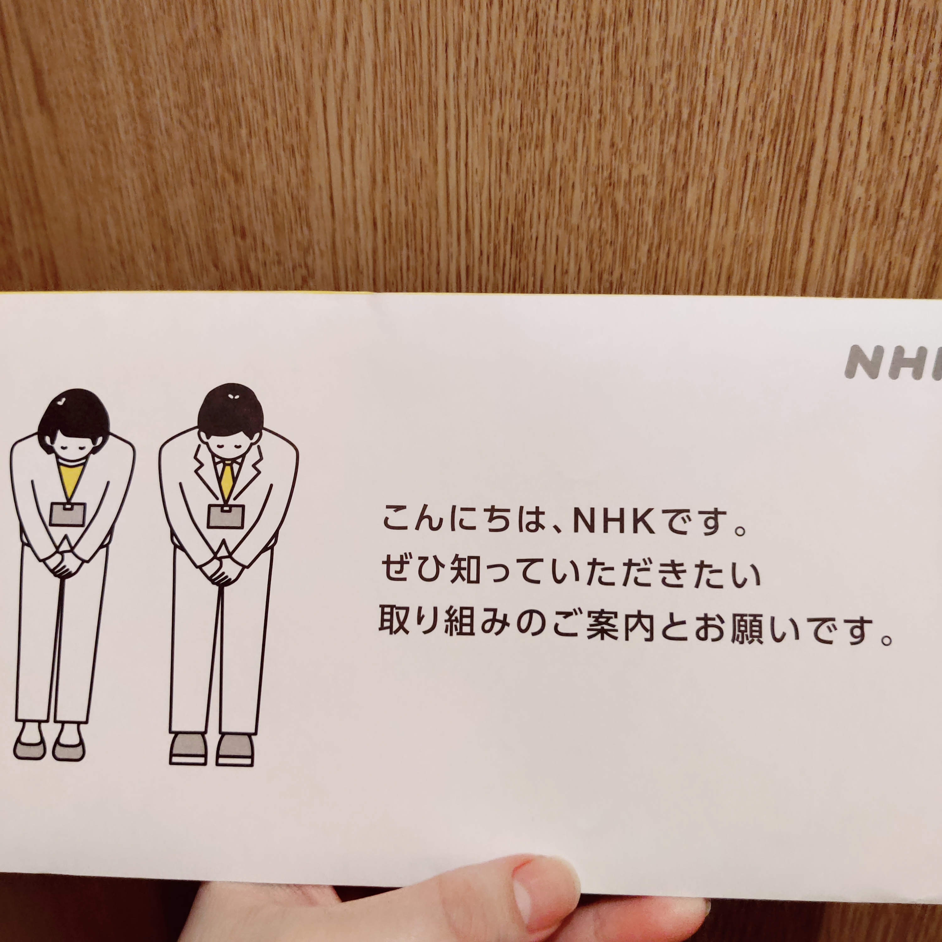 얘네들이 누구냐하면 한국에서 공중파 수신료 내듯이 일본에서는 TV를 보는 사람은 NHK를 보지 않아도 수신료를 내야 하는데 그걸 받으러 다니는 애들이에요. 아무것도 택배를 시킨 적이 없는데 갑자기 인터폰이 울리면 거의 얘네들이라고 보면 됩니다.
