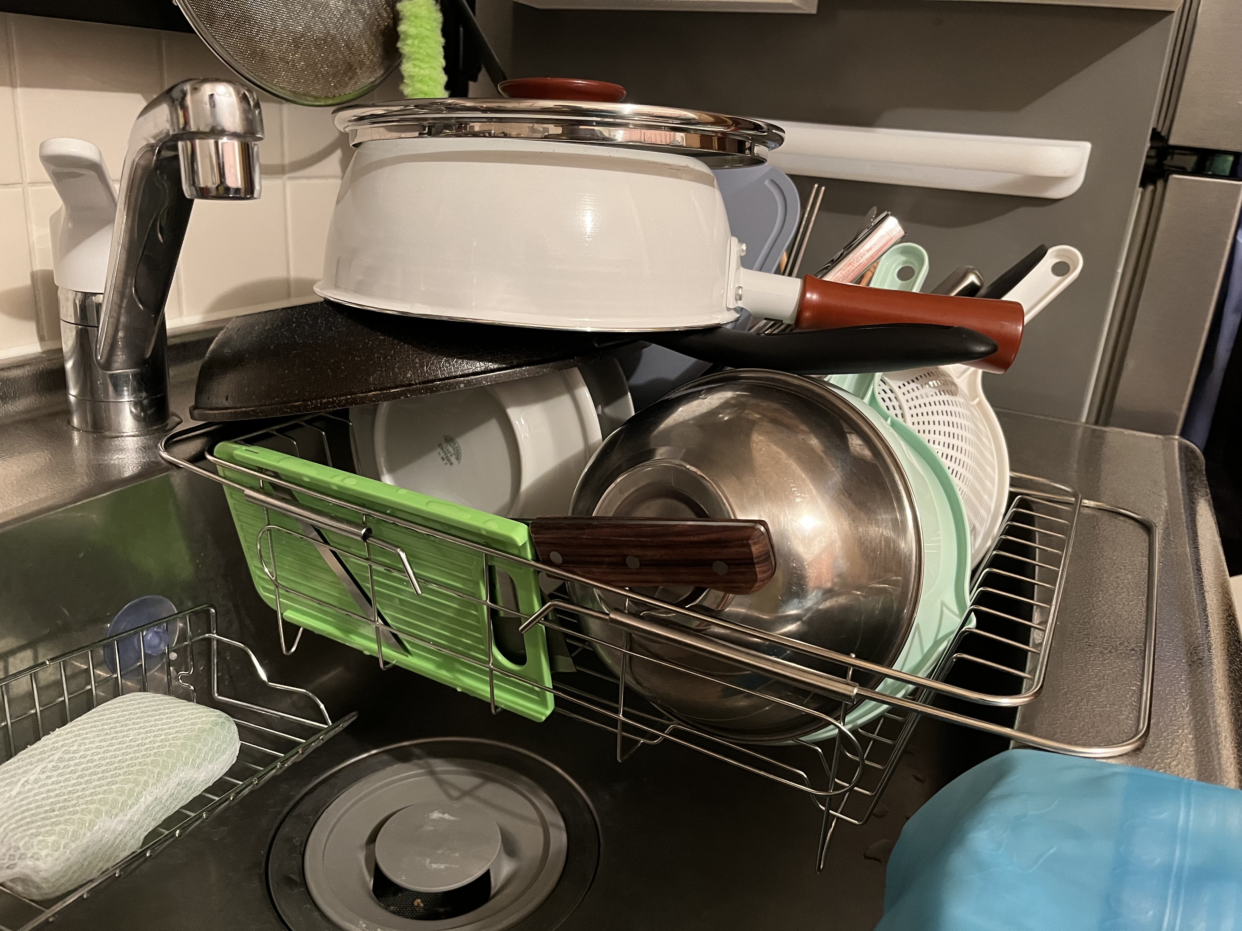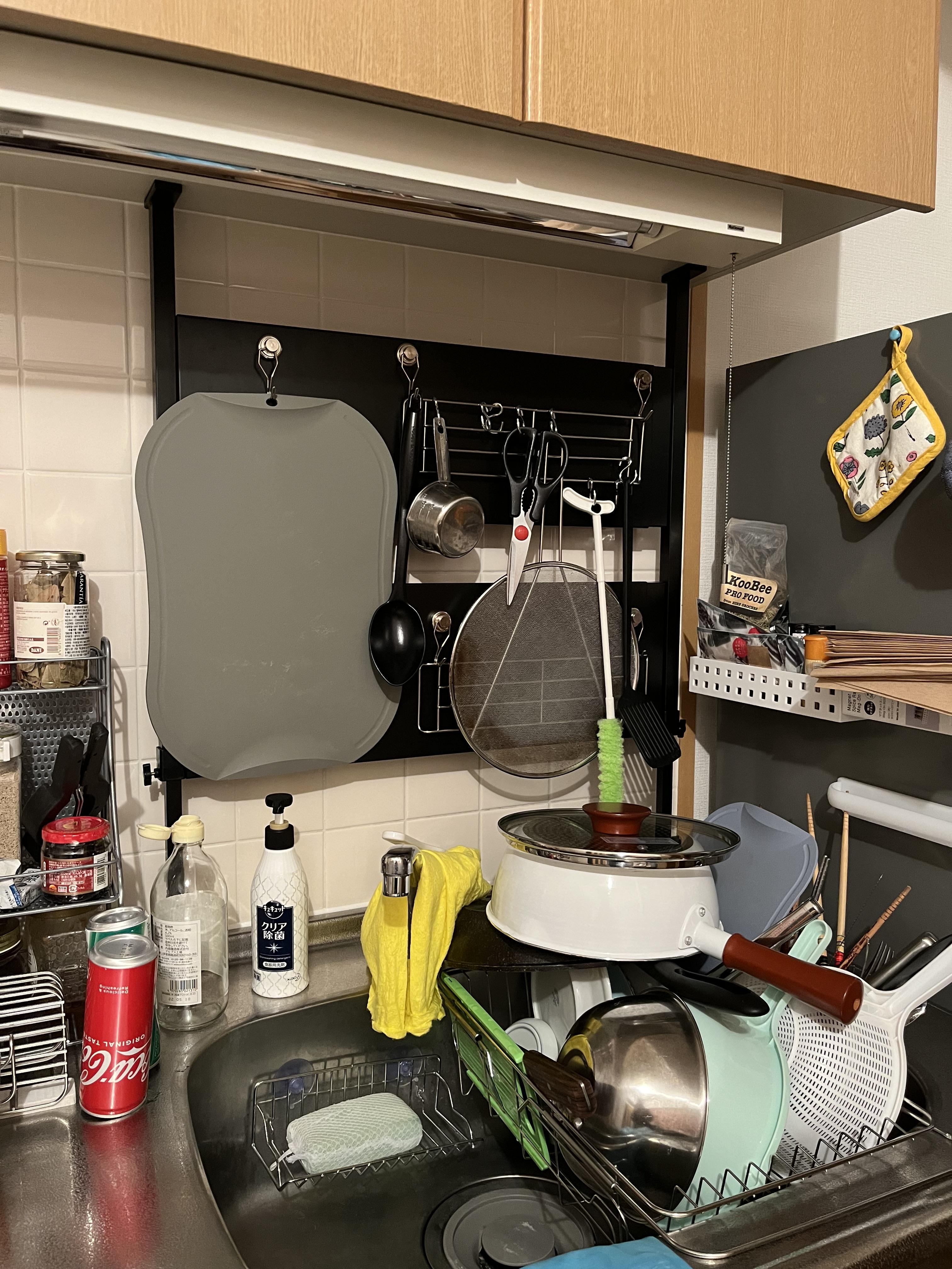 위 1-2) 에 첨부한 사진에서도 보실 수 있다시피 설거지 하고 물기를 뺄 때 적당히 놓을 곳이 없어서 저는 싱크대에 스테인레스 랙을 하나 놔뒀어요. 저는 싱크 테두리에 딱 걸쳐서 놔둘 수 있는 제품인데 'シンク 水切り ラック'라고 검색하시면 여러가지 형태의 제품이 나올거니 필요하신 것을 고르시면 된답니다.