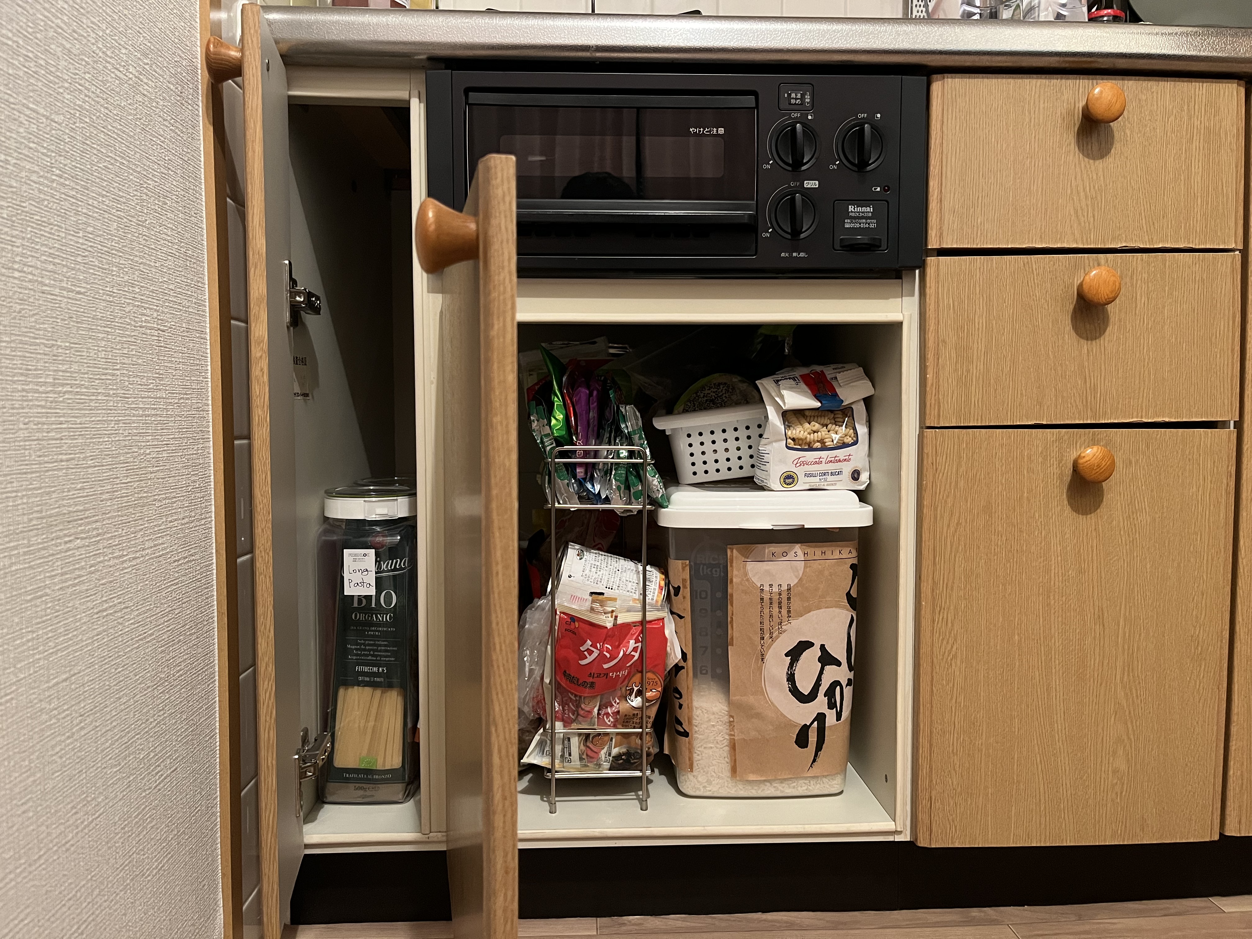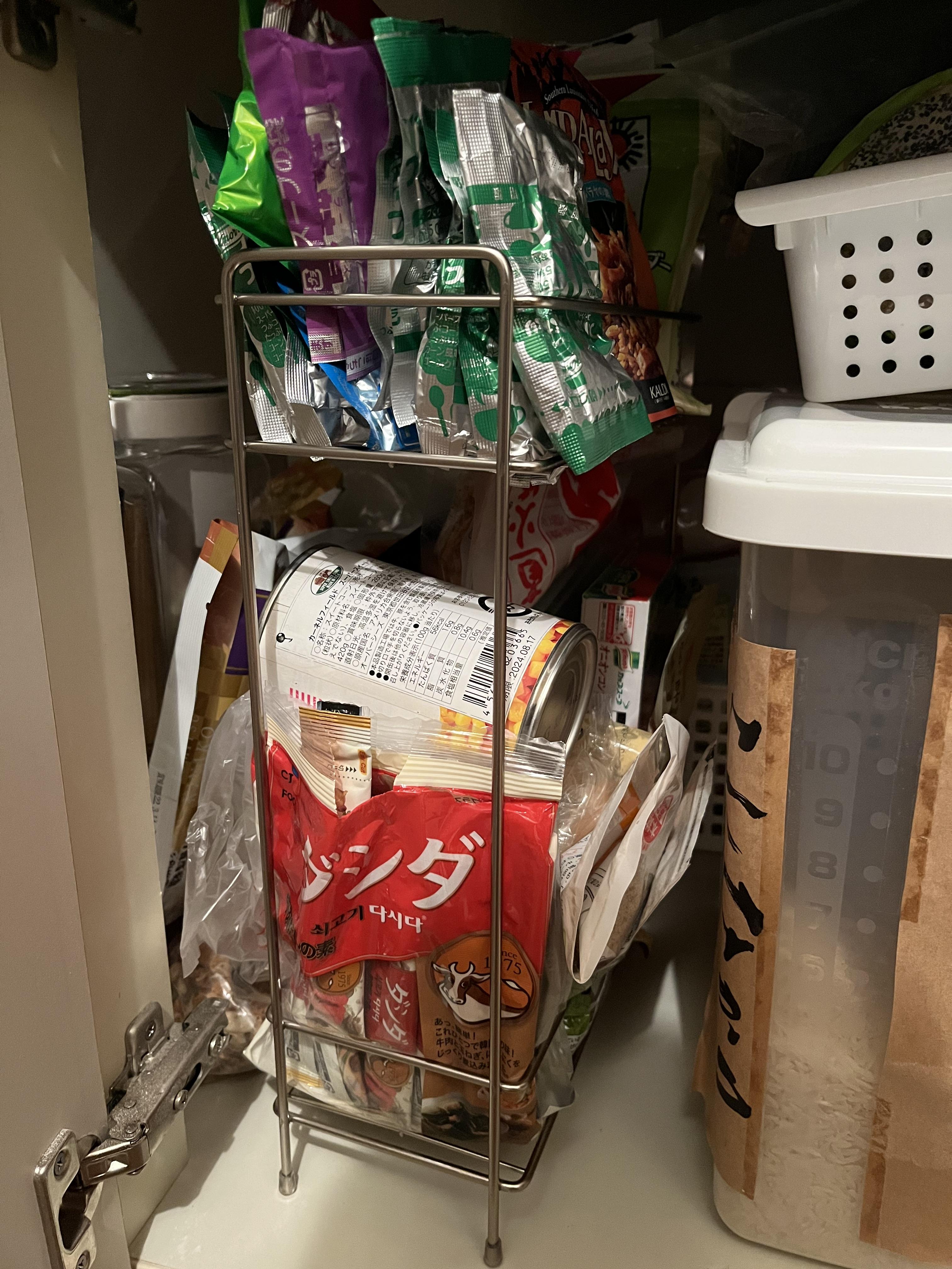 저는 가끔씩 요리를 하다보니까 가스레인지 아래에 건조식품이나 조미료 등을 넣어두는데 쌀통을 넣고나니 문이 애매해 어떻게 정리해야할지 모르겠더라고요. 니토리에도 여러 수납 제품은 팔고 있는데 다 크기가 안 맞았거든요. 그래서 욕실에서 샴푸 놔두는 랙을 사서 정리해봤는데 딱이었어요.