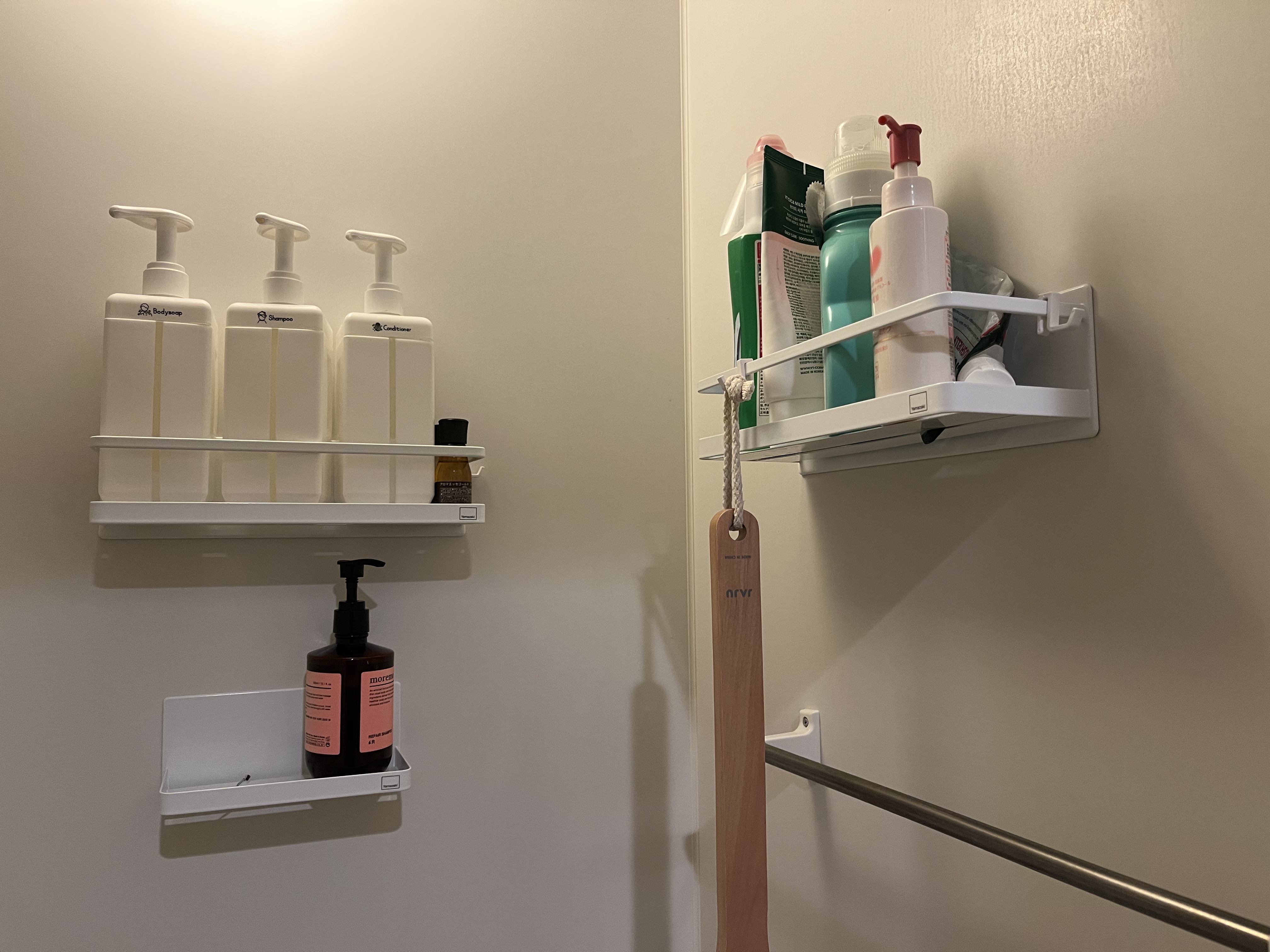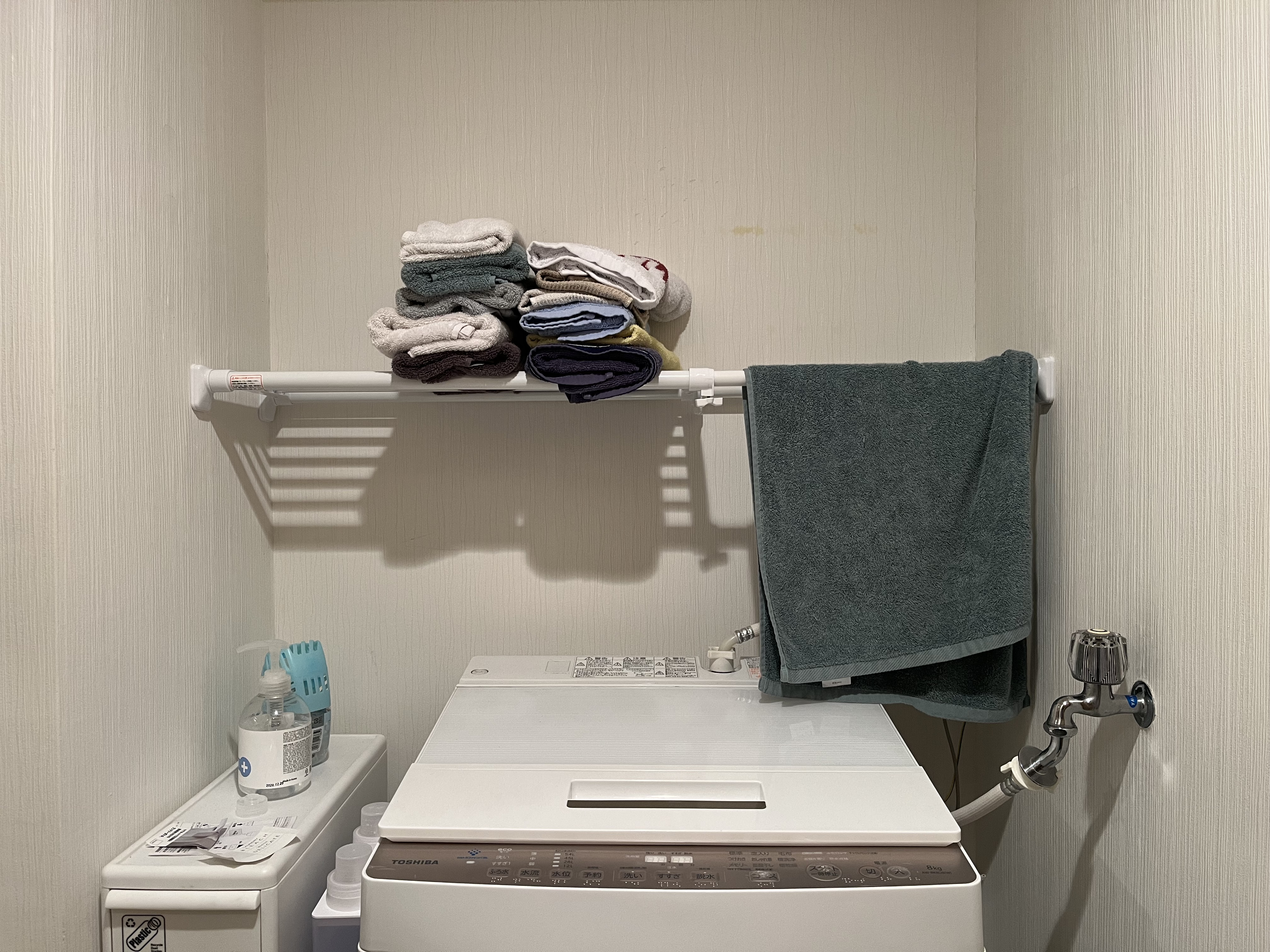 일본 욕실은 한국처럼 넓지 않아서 수건을 넣을 자리가 세면대 아래 정도밖에 없는데 저는 그 안에 바디워시 리필용 제품 등을 넣어놨기 때문에 따로 공간이 필요했어요. 저번 집에서 쓰던걸 열심히 닦아서 가져왔는데 길이가 맞지 않더라고요.. 이사하기 전에 집 보실 때는 꼭 수납공간을 만들 수 있을만한 곳은 다 길이 재 놓으세요!