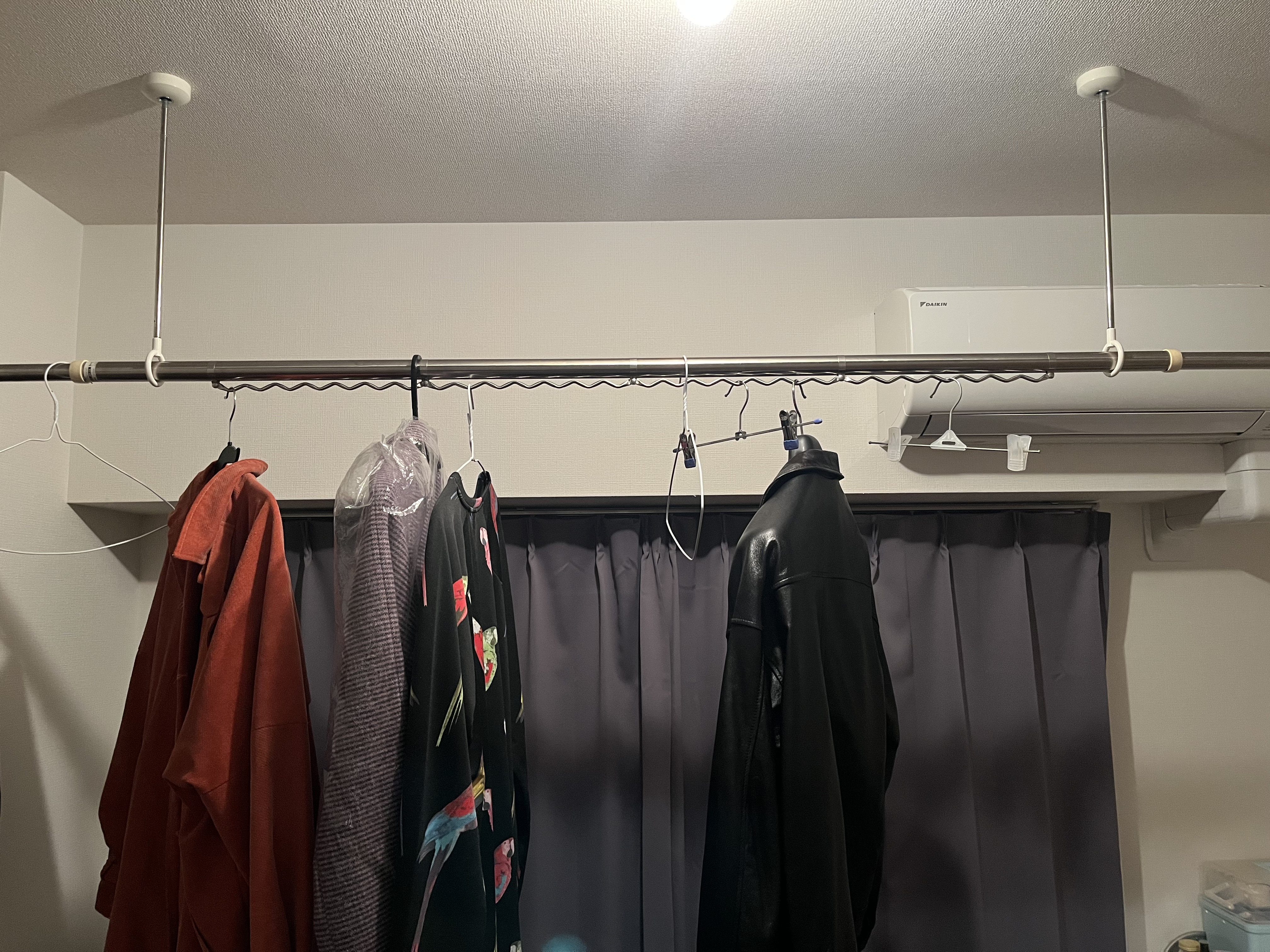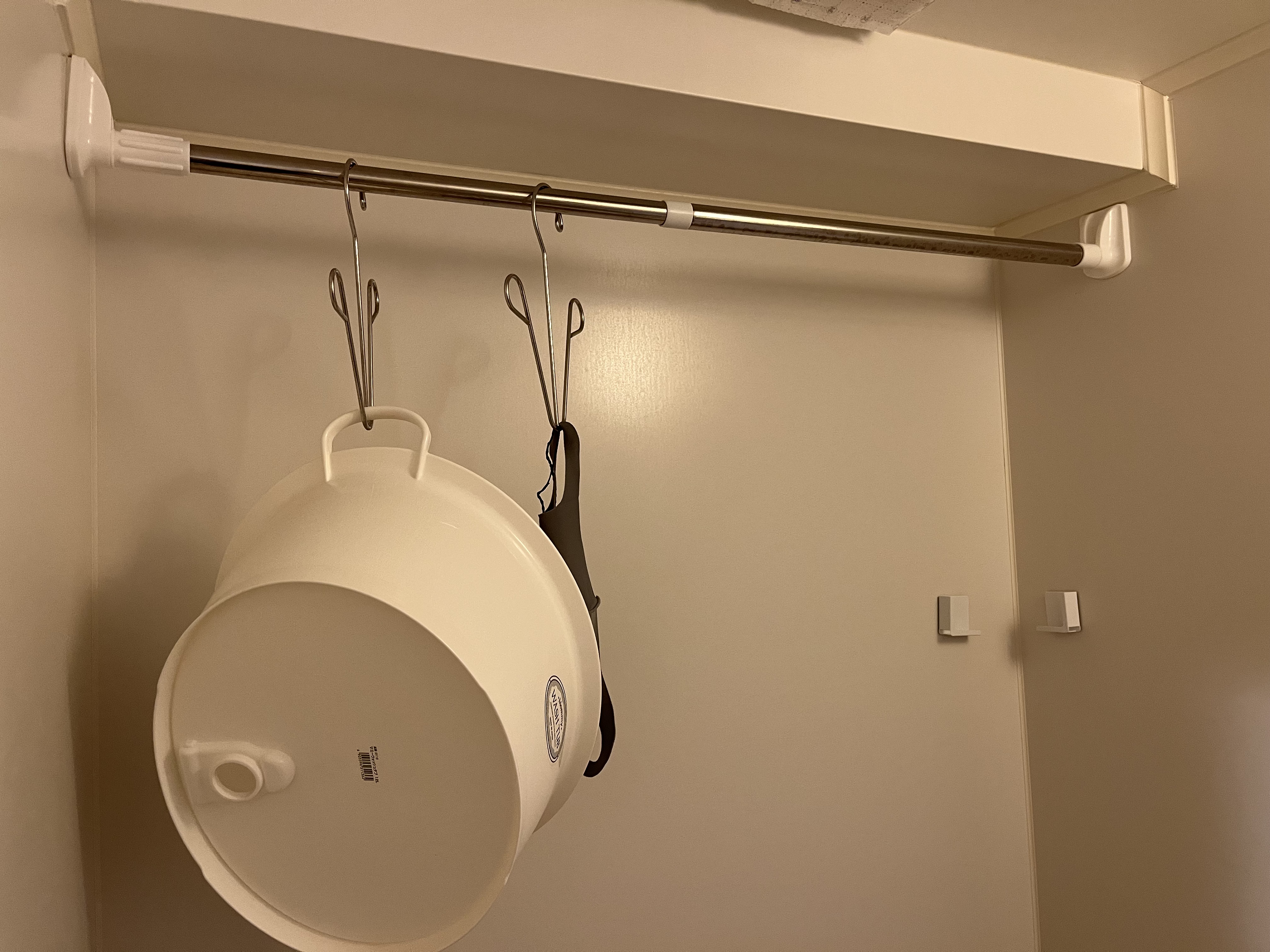 그래서 이번에는 열심히 닦아온 아이는 쓸데가 없어졌으니 버리고(사실 더 닦지 못하는 부분이 있어서 찝찝하긴 했음) 니토리에서 새로 구매했습니다. 옷장에 걸은 봉이 아니라 부엌에 설치한 아이를 눕힌 것과 같은 형태에 가까워요(그림자에 잘 보이시죠?).