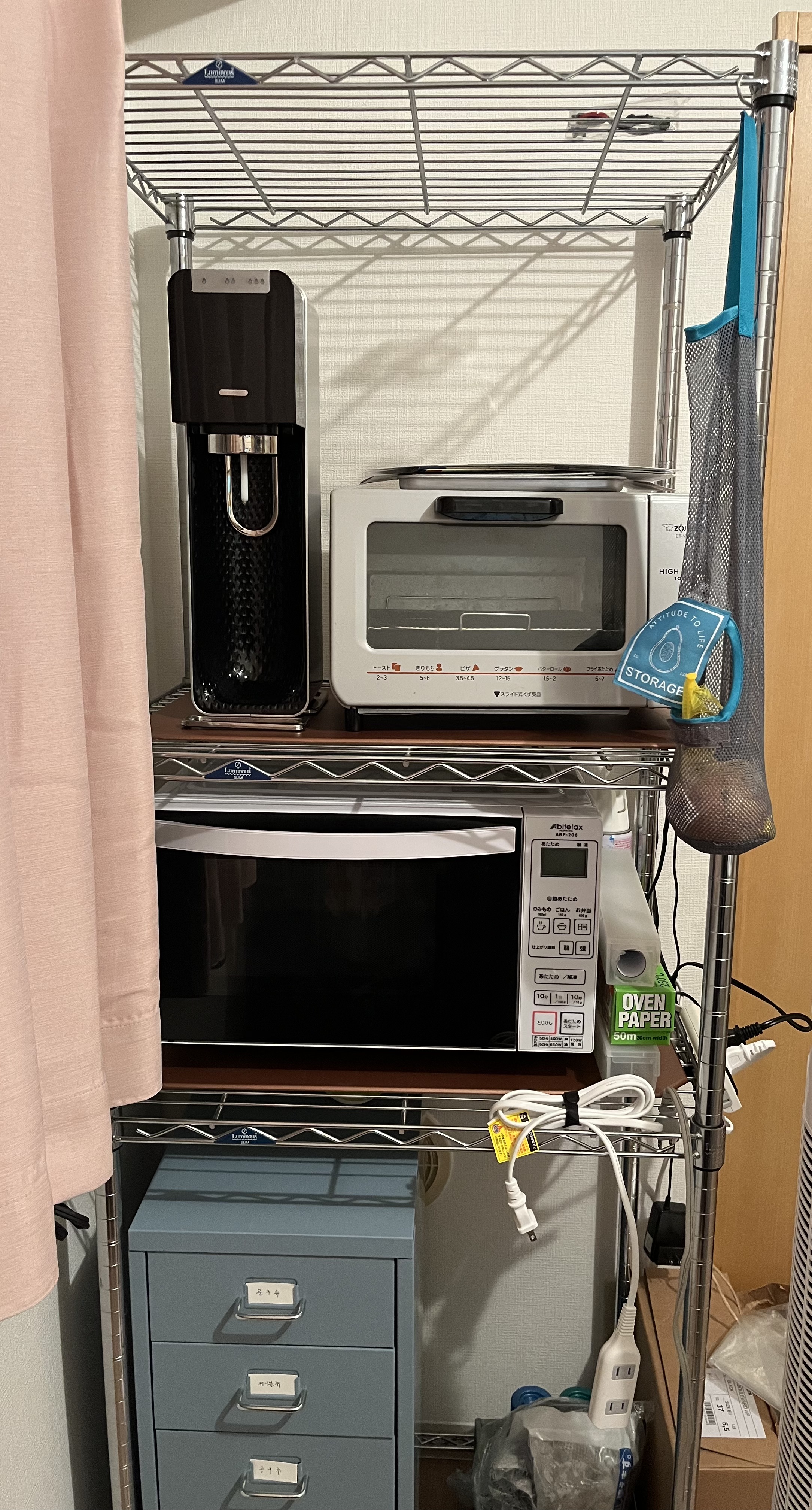 이건 대학원 기숙사 때부터 쓰던건데 가전제품 등을 올려놓는 선반으로 사용하고 있어요. 대체로 ラック(락꾸)라고 검색하면 이런 커다란 가전제품용? 소형 냉장고를 가장 아래에 수납할 수 있는 형태의 제품을 많이 볼 수 있을거에요. 딱히 압축봉으로 천장에 고정시키지 않아도 지진이 일어날 때마다 살짝 흔들리고 말았기 때문에 웬만해서는 넘어지거나 안에 있는 제품이 떨어지진 않는 것 같아요.