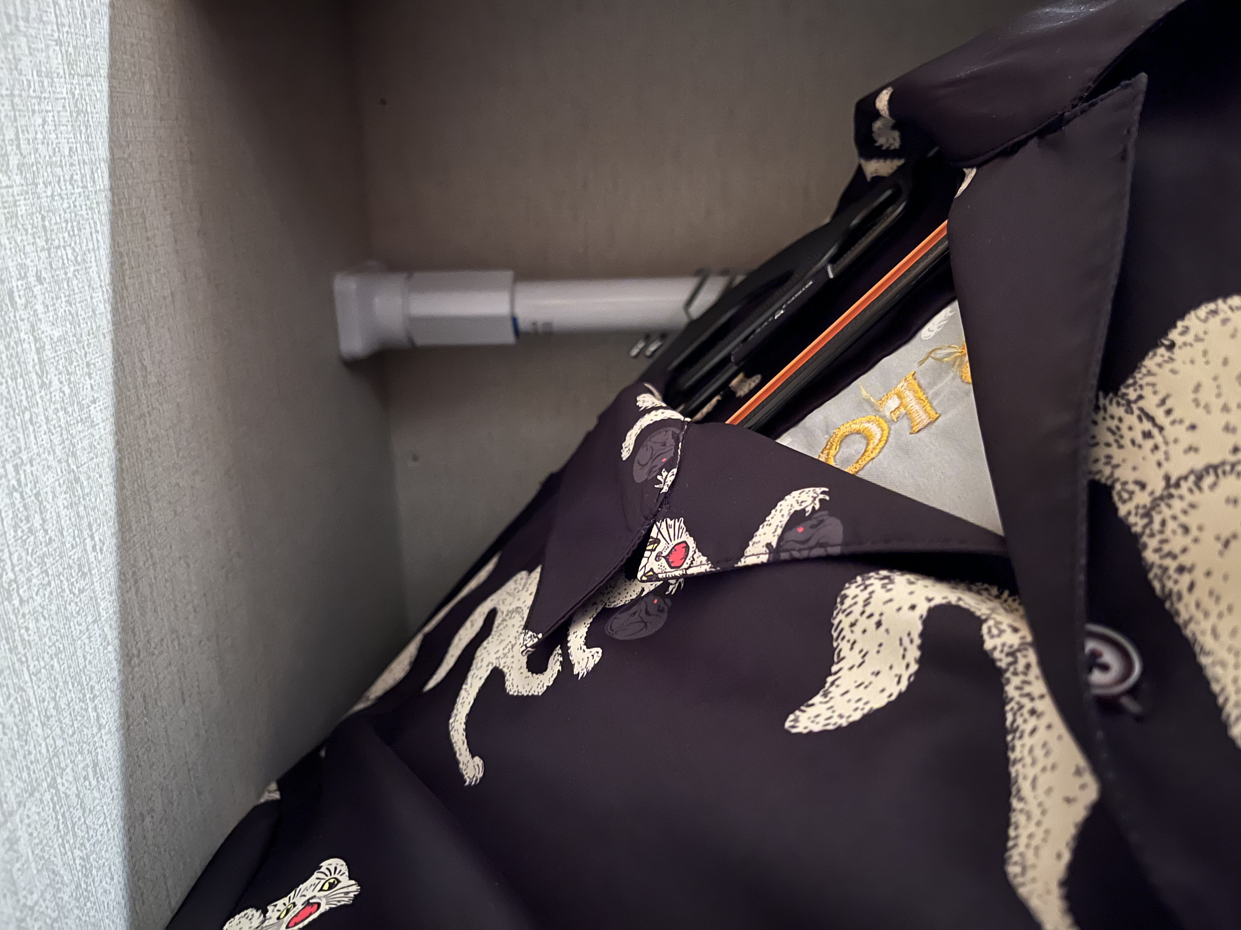 그래서 생각한 것이 옷장 천장에 봉을 하나 설치해서 옷걸이를 2단으로 걸 수 있게 하는 방식이에요. 안쪽에 원래 있는 곳에는 기장이 짧은 옷을 걸고 천장에 설치한 압축봉에는 코트나 원피스, 기장이 있는 셔츠 등을 걸어두었답니다.