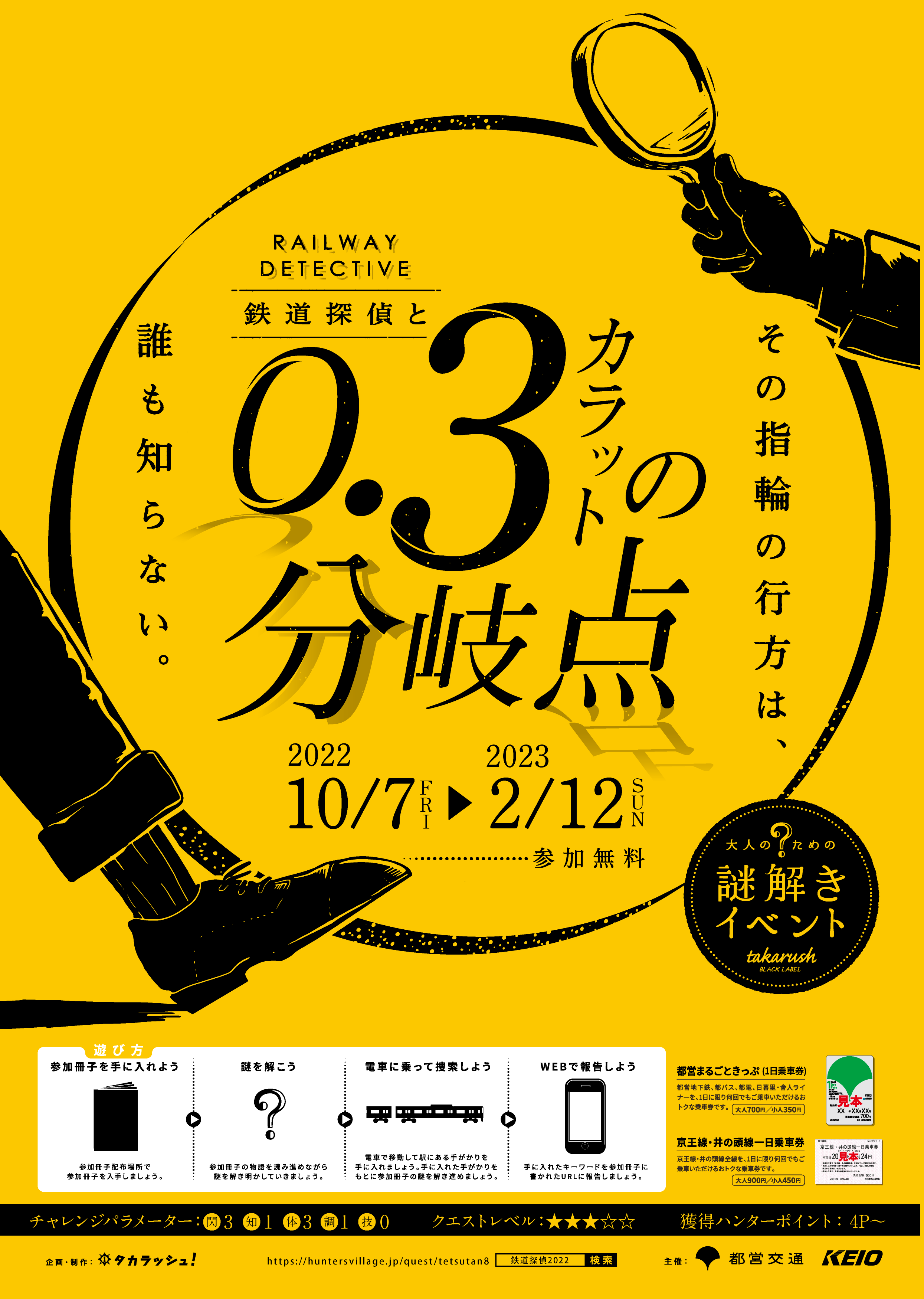 참고로 얘네 말고도 '0.3カラットの分岐点(0.3 캐럿의 분기점)'이라고 도쿄도 교통국이 개최하는 (都営新宿線(토-에-신쥬쿠센; 도영신주쿠선)과 京王線(케이오-센; 케이오선) 타고 돌아다니는) 야외 방탈출게임도 있는데 저희 집에서 신주쿠선이나 케이오선 타러 가기도 복잡하고 해서 참가하진 않았어요. 참가했던 사람들 리뷰를 보니까 거의 역사 밖으로 나가지 않고도 문제를 풀 수 있다고 하데요?