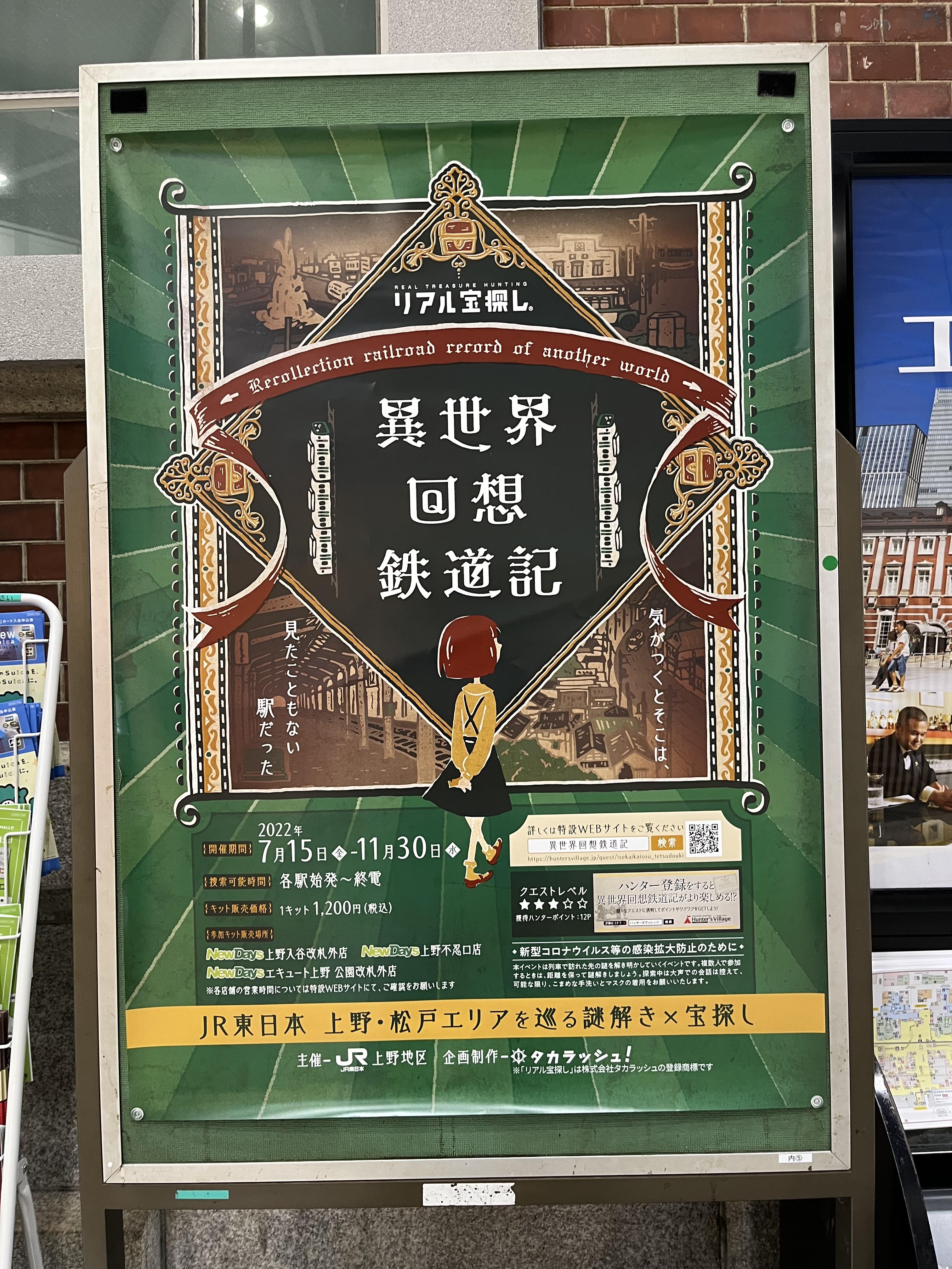 사실 이것 말고도 JR동일본에서는 '異世界回想鉄道記(이세계 회상 철도기)'라는 야외방탈출도 진행하고 있어서 그것도 재밌어보이긴 했는데 우에노와 마츠도 주변만 돌아다니는 것이라길래 JR타고 전체적으로 도쿄를 한바퀴 도는 위 이벤트가 더 하루를 잘 쓸 수 있을 것 같더라고요.
