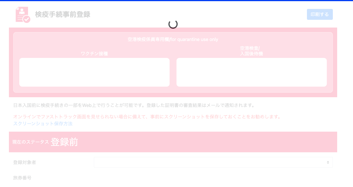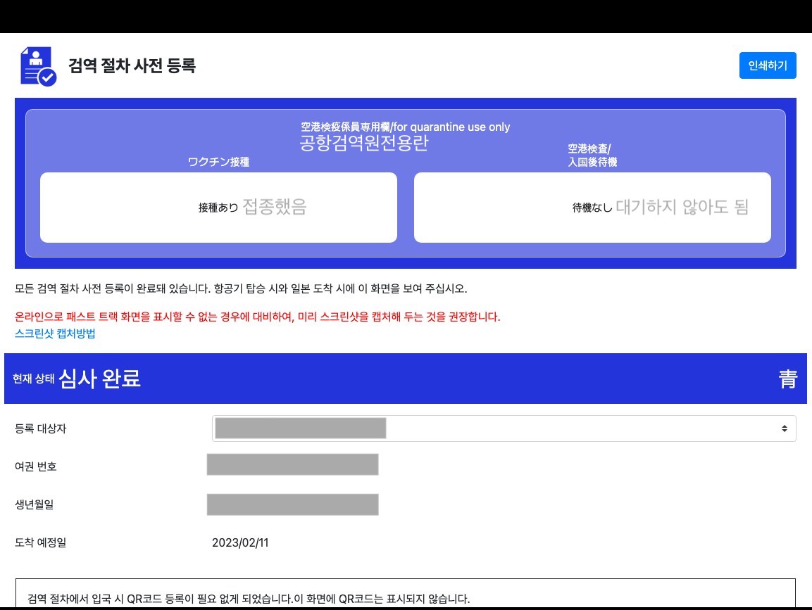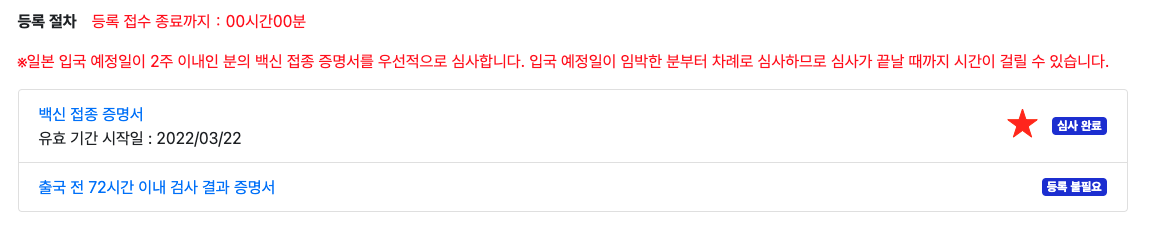 백신 정보를 등록하기 전에는 왼쪽 붉은 색 화면이 나오고 심사가 끝나기 전 까지도 이 상태가 유지돼요. 심사 결과는 메일로 통지되며 일본에 도착할 때까지 심사가 완료되지 않았다면 일본 도착 시에 붉은색 화면과 백신 접종 증명서 혹은 PCR검사 증명서를 보여주셔야 해요. 즉, 입국할 때 두갈래로 나뉘는데 푸른색 화면인 분들은 바로 입국 수속장으로 가고 붉은색 분들은 한단계 더 거치셔야 합니다.