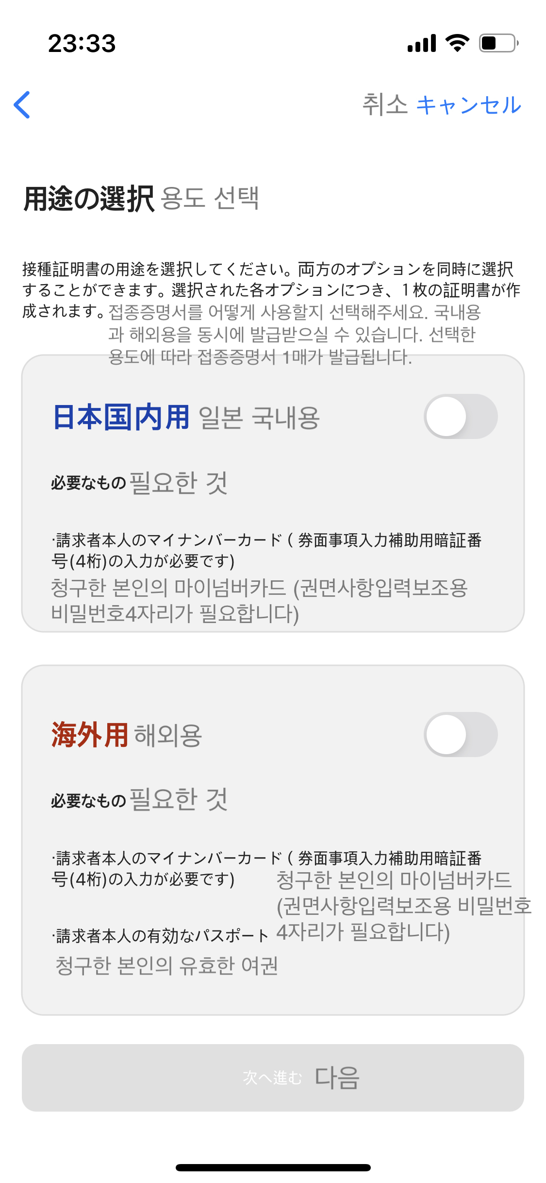 '백신 접종 증명서'를 눌러서 위 接種証明アプリ에서 발급받아 파일로 저장한 증명서를 업로드 합니다.