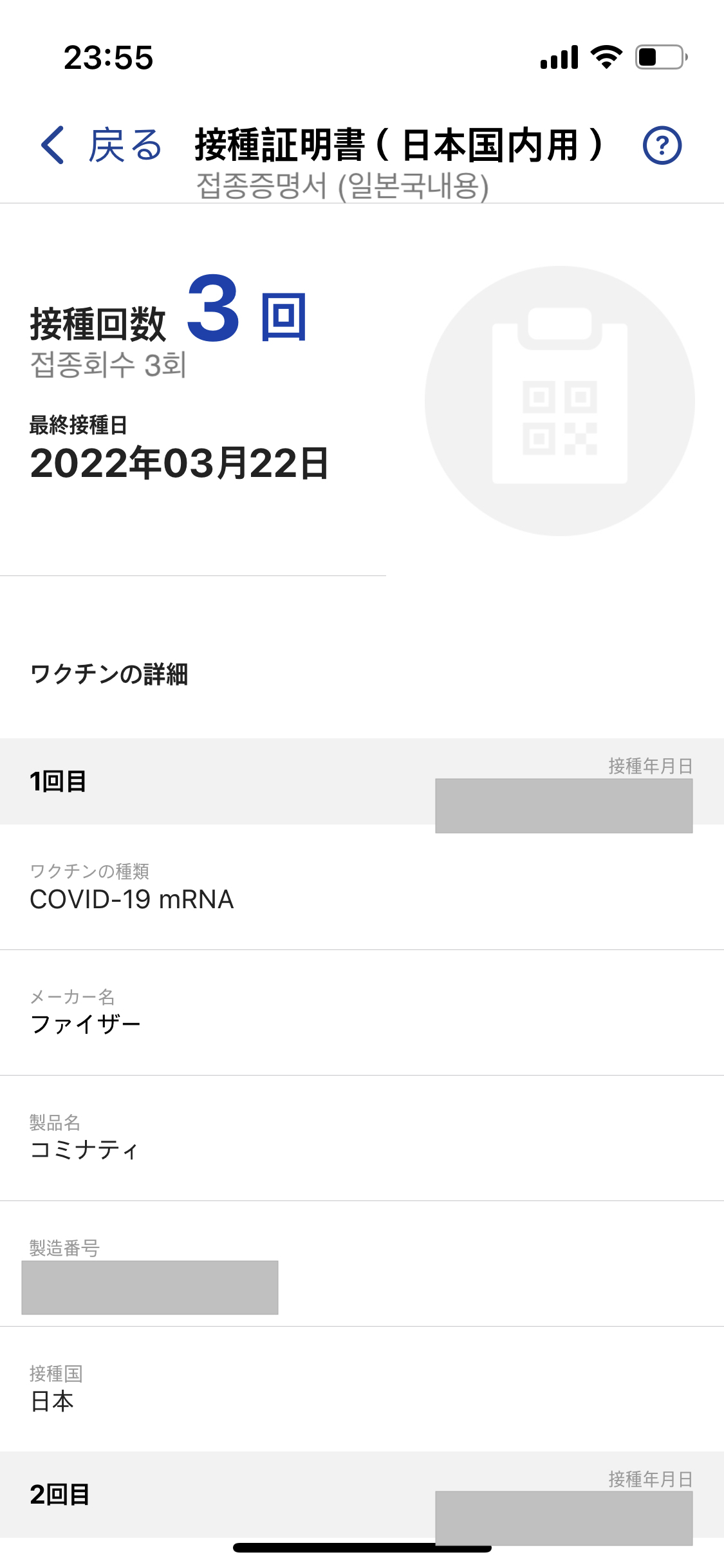 둘 다 '상세 내용을 표시'를 누르면 QR코드와 함께 접종 회수, 최종 접종일, 이름, 국적, 여권번호(해외용만), 생년월일과 함께 스크롤을 내리면 아래와 같이 접종한 백신의 상세 정보가 표시됩니다.