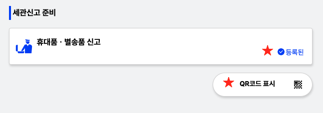 QR코드는 입국수속 마치고 짐 찾아서 세관신고서 제출하기 전에 표시해서 전자신고 단말기에 여권과 함께 스캔해야 나가실 수 있어요. 줄 서기 전에 먼저 단말기에 가셔야 합니다.