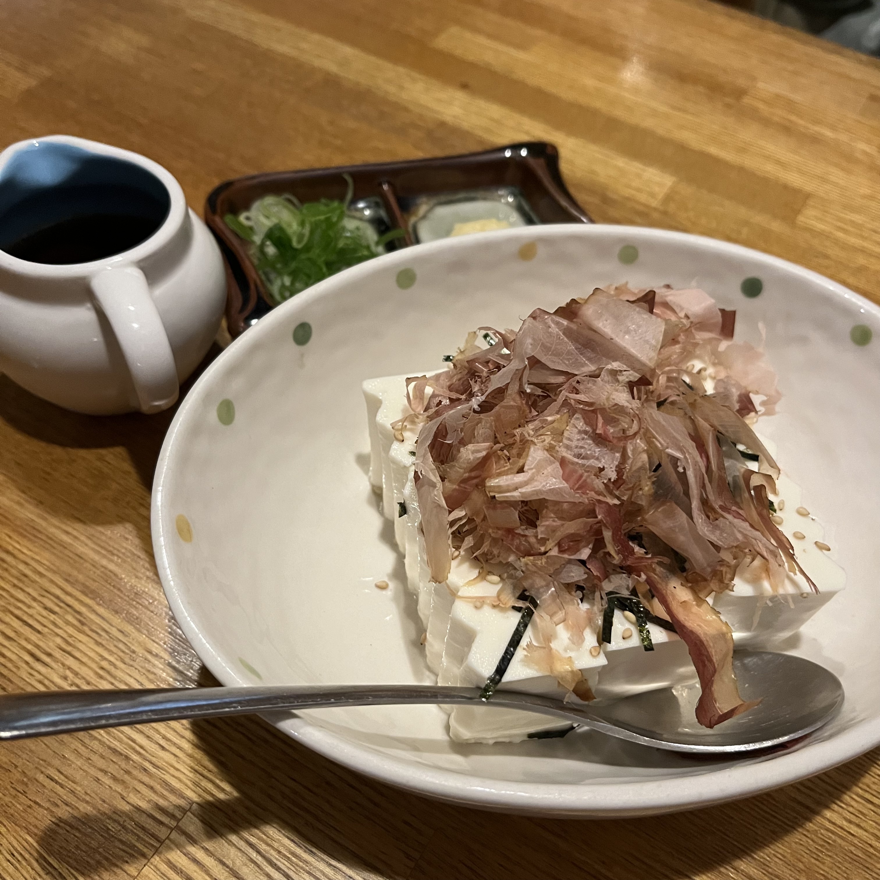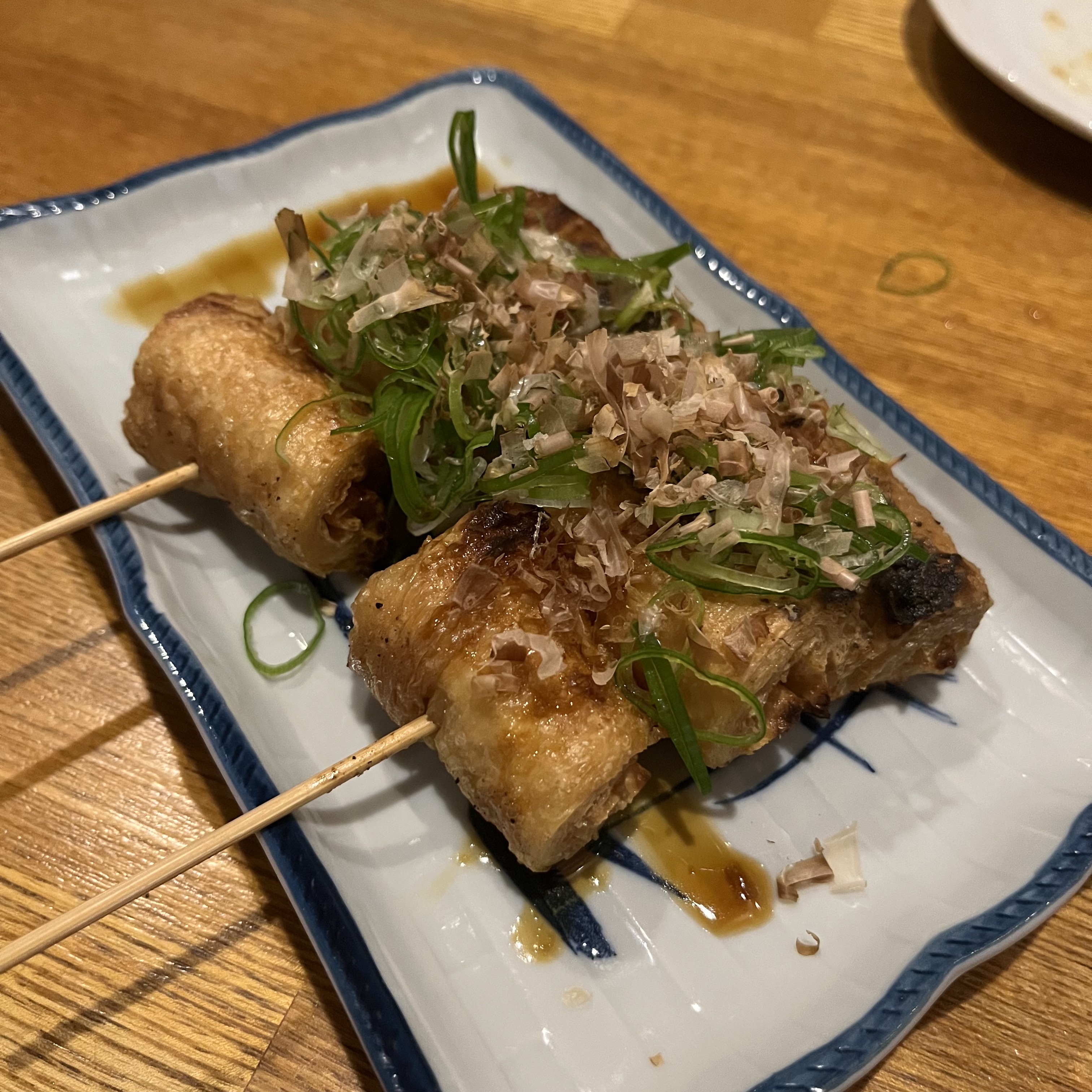 홋카이도가 콩의 산지로도 유명해서 일단 油揚げ串(아부라아게쿠시; 두부 튀김꼬치)랑 冷奴(히야얏코; 냉두부) 시켰는데 진짜 맛있었어요! 슈퍼에서 흔히 사 먹는 두부와 다르게 묵직하고 고소~하더라고요.