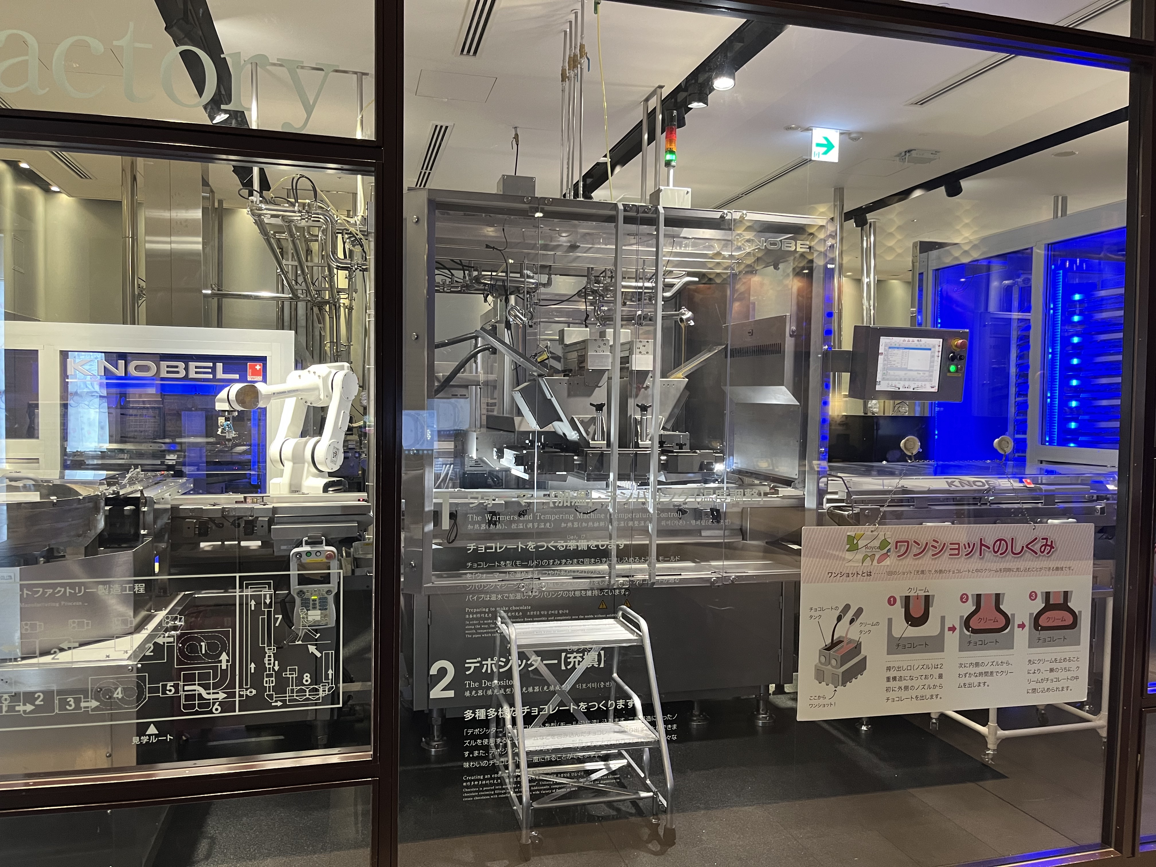 3층 연결통로에는 로이스 초콜릿 공장, 도라에몽 박물관, 헬로키티 박물관이 있었습니다. 초콜릿 공장은 밖에서 보는 형식이었어요. 기계가 초콜릿을 만들고 있더라고요.
