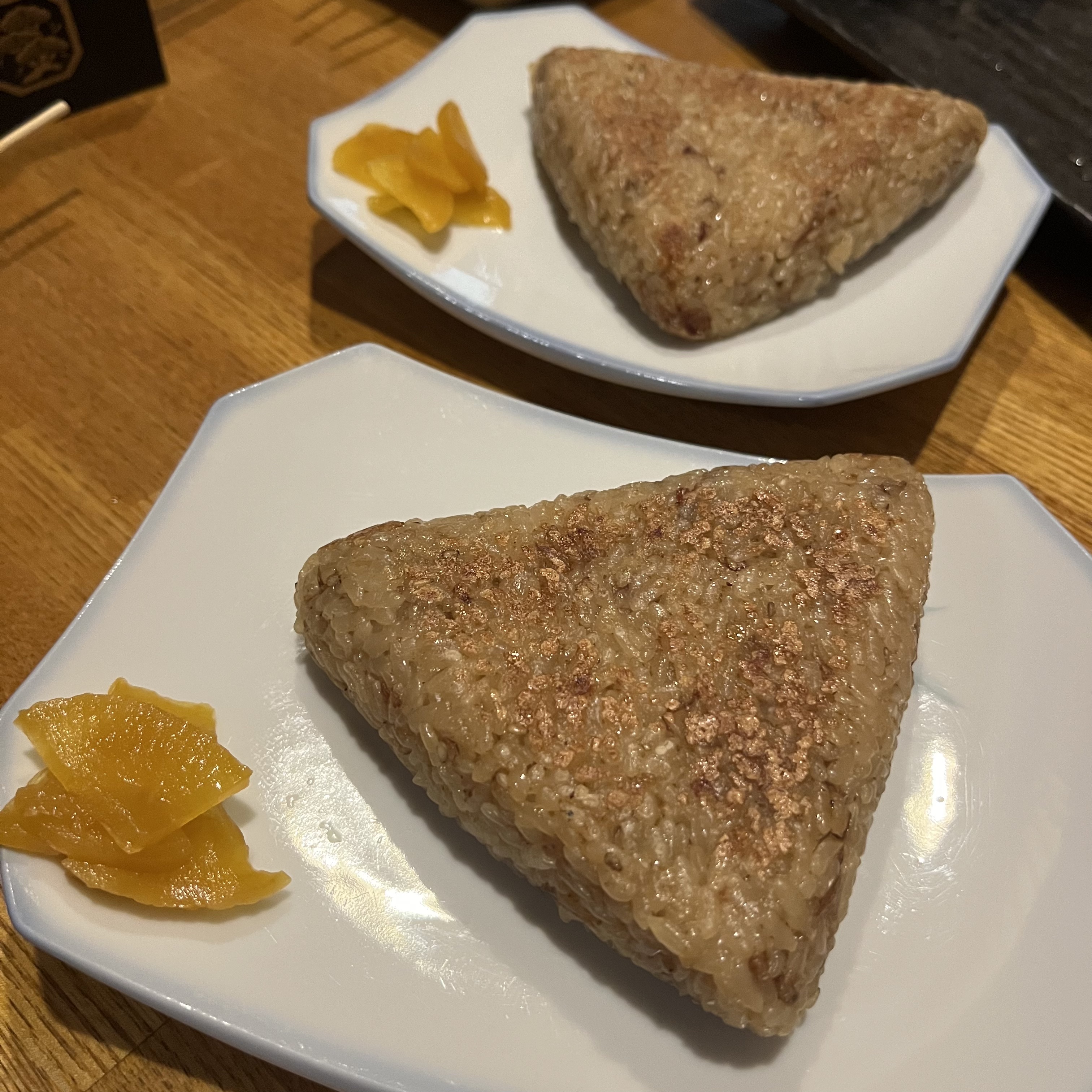 이 집 야끼오니기리는 안에 가츠오부시를 넣어서 넓고 납작하게 펴서 구운게 특징이에요.